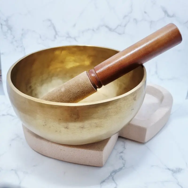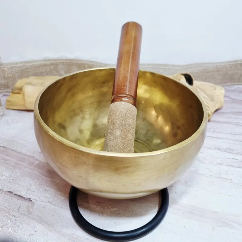 Ta tibetanska posoda vas bo očarala s svojim klasičnim in brezčasnim videzom. Celotna posoda se lesketa v čudoviti zlato-bronasti barvi, ki spominja na starodavno modrost in trajno lepoto. Znotraj posode se barva globoko lesketa, medtem ko je zunanjost nežno patinirana, kar daje videz nežne starine in bogate zgodovine. Priloženo leseno tolkalo ima čudovit leseni ročaj v rjavem odtenku, ki je zaključen z mehkim, svetlo rjavim, žametnim delom, idealnim za drsenje ob robu posode in ustvarjanje božanskega zvoka. To ni le inštrument, ampak ročno izdelano umetniško delo, ki izžareva mir in eleganco.