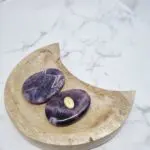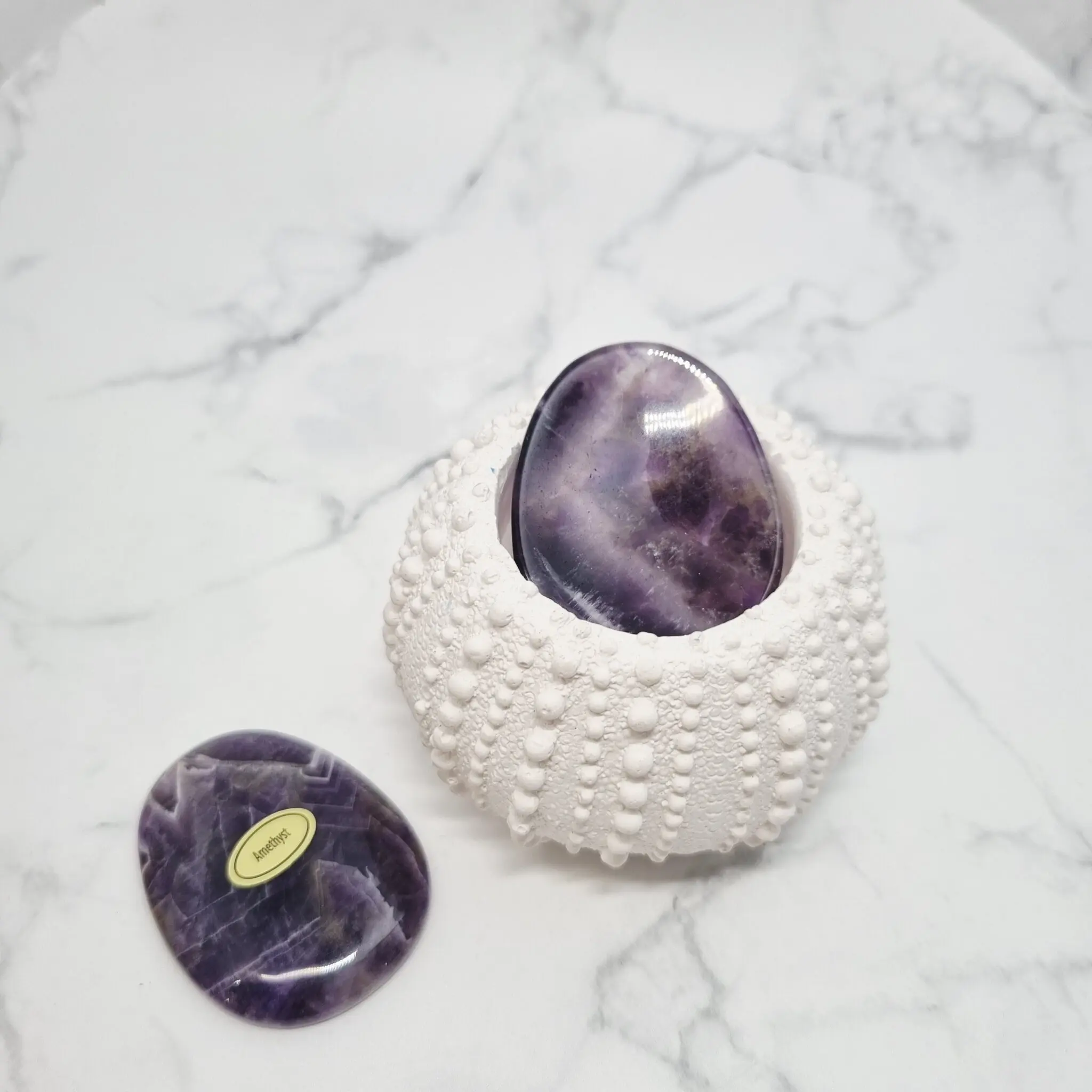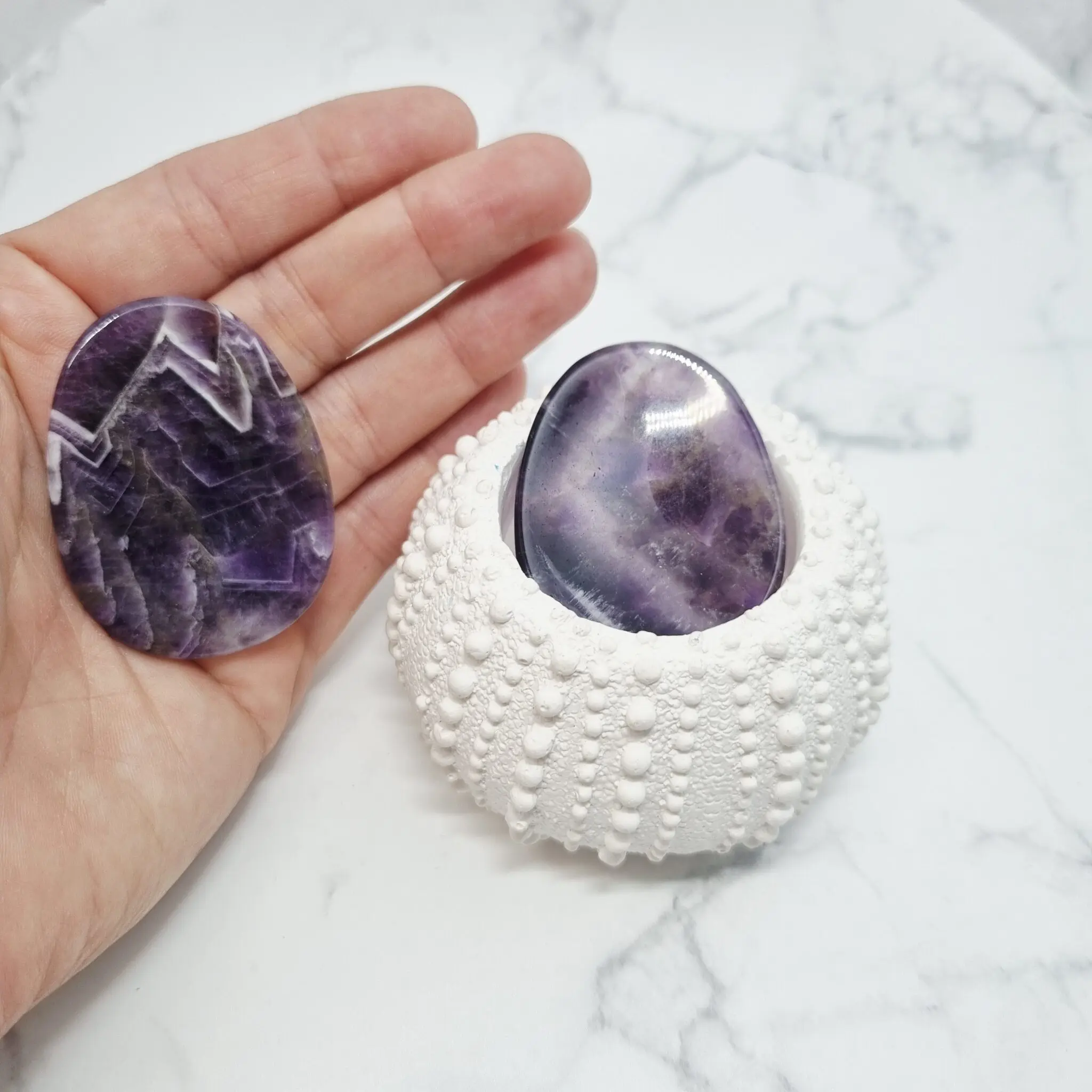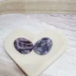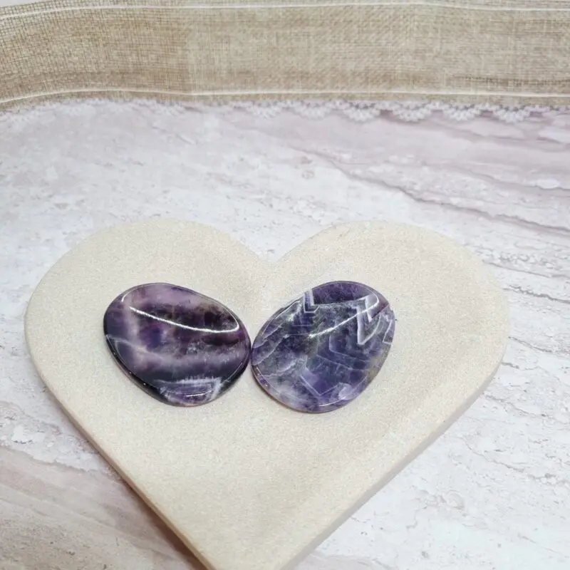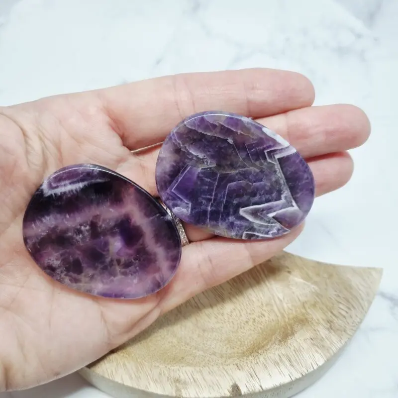 Naši ametistni kamni za pomiritev so preprosto osupljivi. Vsak kos se ponaša z bogatimi, globokimi odtenki vijolične barve, ki prehajajo v nežnejše sivke in včasih celo v prosojne bele pasove. Ta zanimiva pasasta struktura daje kamnu edinstven in naraven videz. Oblikovani so gladko in ergonomsko, da se popolnoma prilegajo dlani in omogočajo sproščujoč dotik. Njihova polirana površina odseva svetlobo in poudarja prepletanje različnih vijoličnih tonov, kar jih dela resnično privlačne in unikatne.