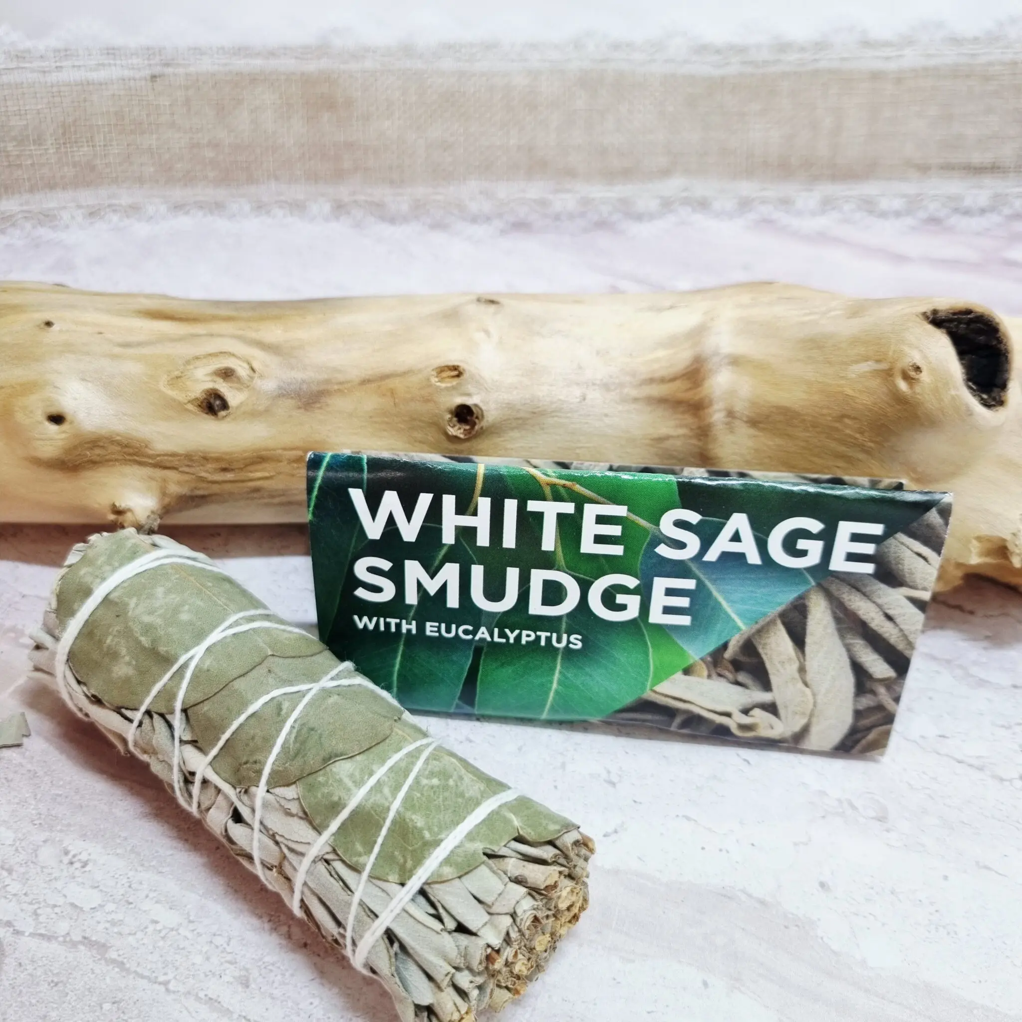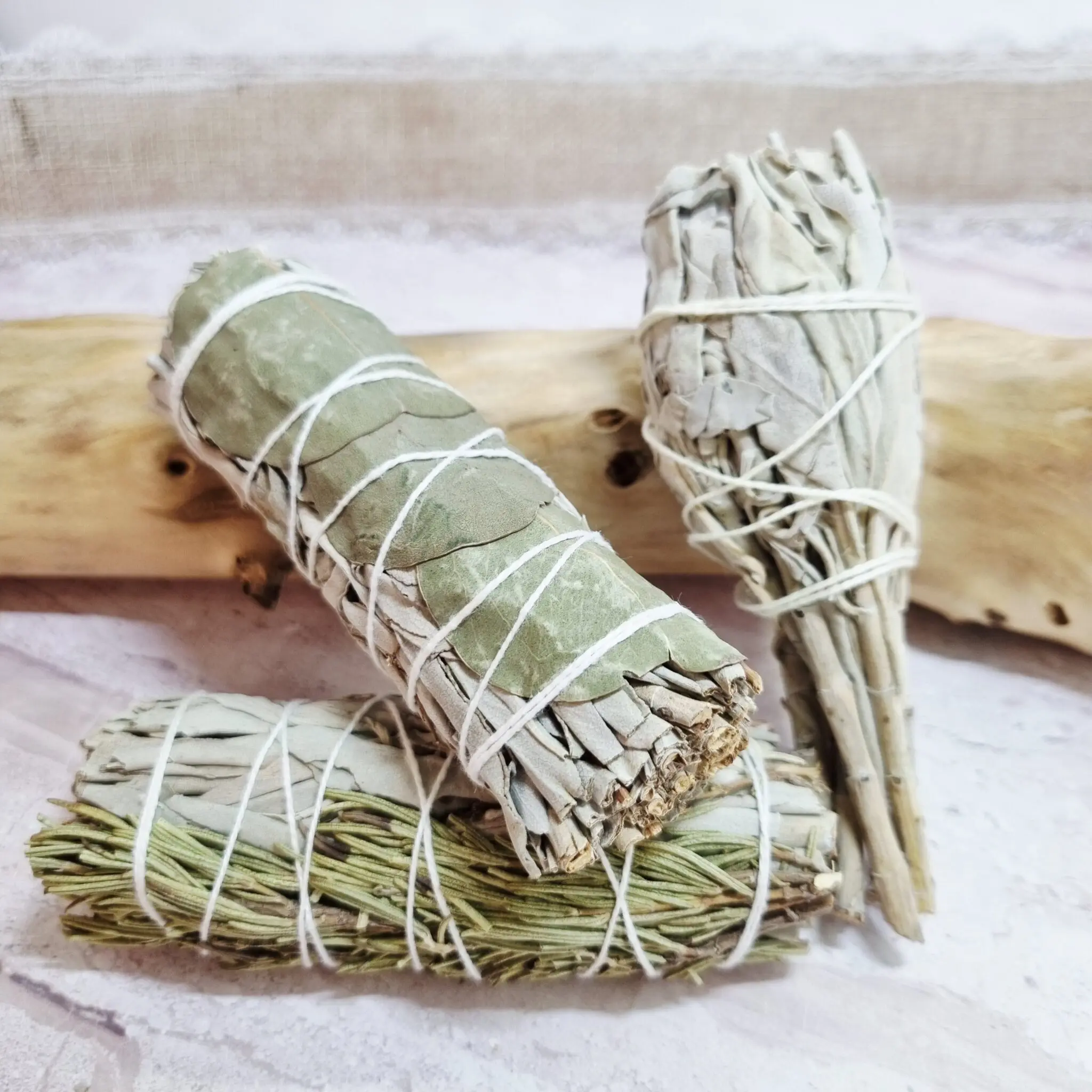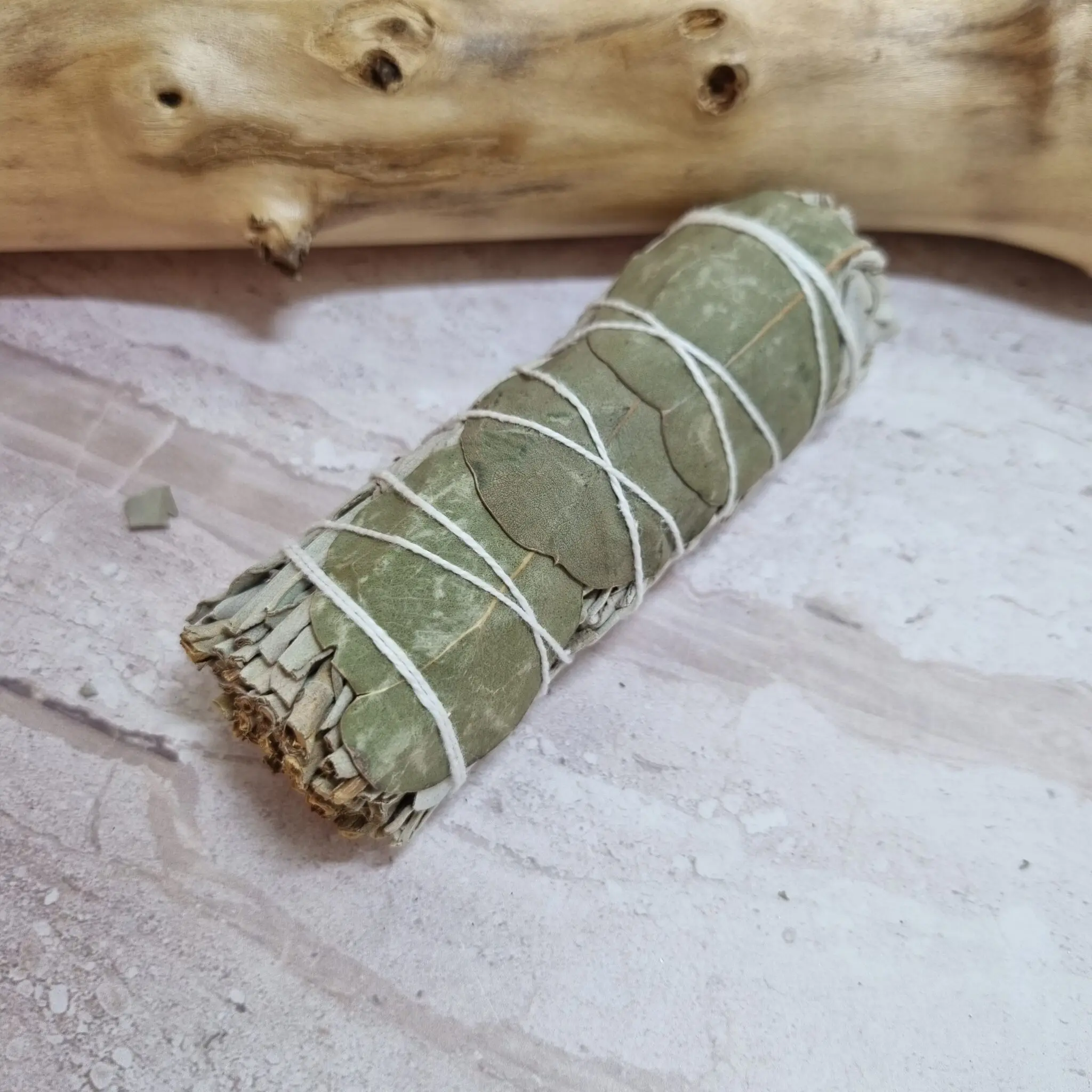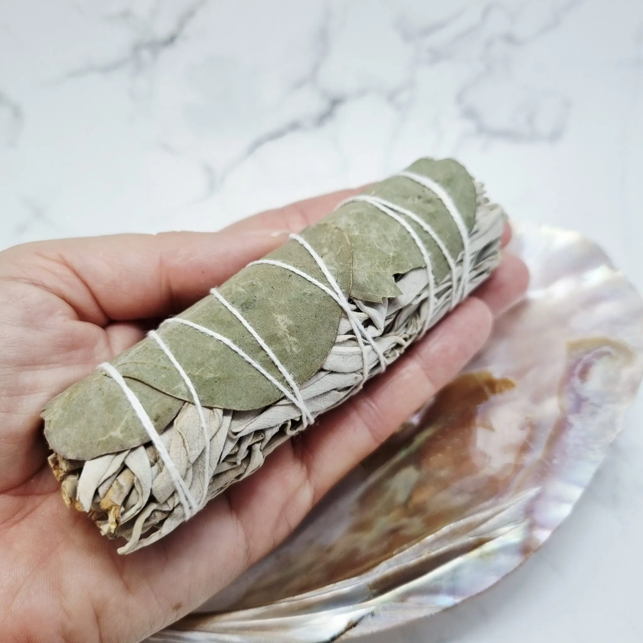 Naš snop belega žajblja in evkaliptusa je skrbno zavit v kompaktno obliko, približno 10 cm dolžine. Prevladujejo nežni, sivo-zeleni odtenki posušenega žajblja, prepleteni z nekoliko večjimi, bolj zelenimi listi evkaliptusa. Celoten snop je elegantno povezan z belo naravno vrvico, ki ga drži skupaj in mu daje urejen videz, pripravljen za uporabo. Vsak snop je unikatno ročno zavit in odraža naravno lepoto.