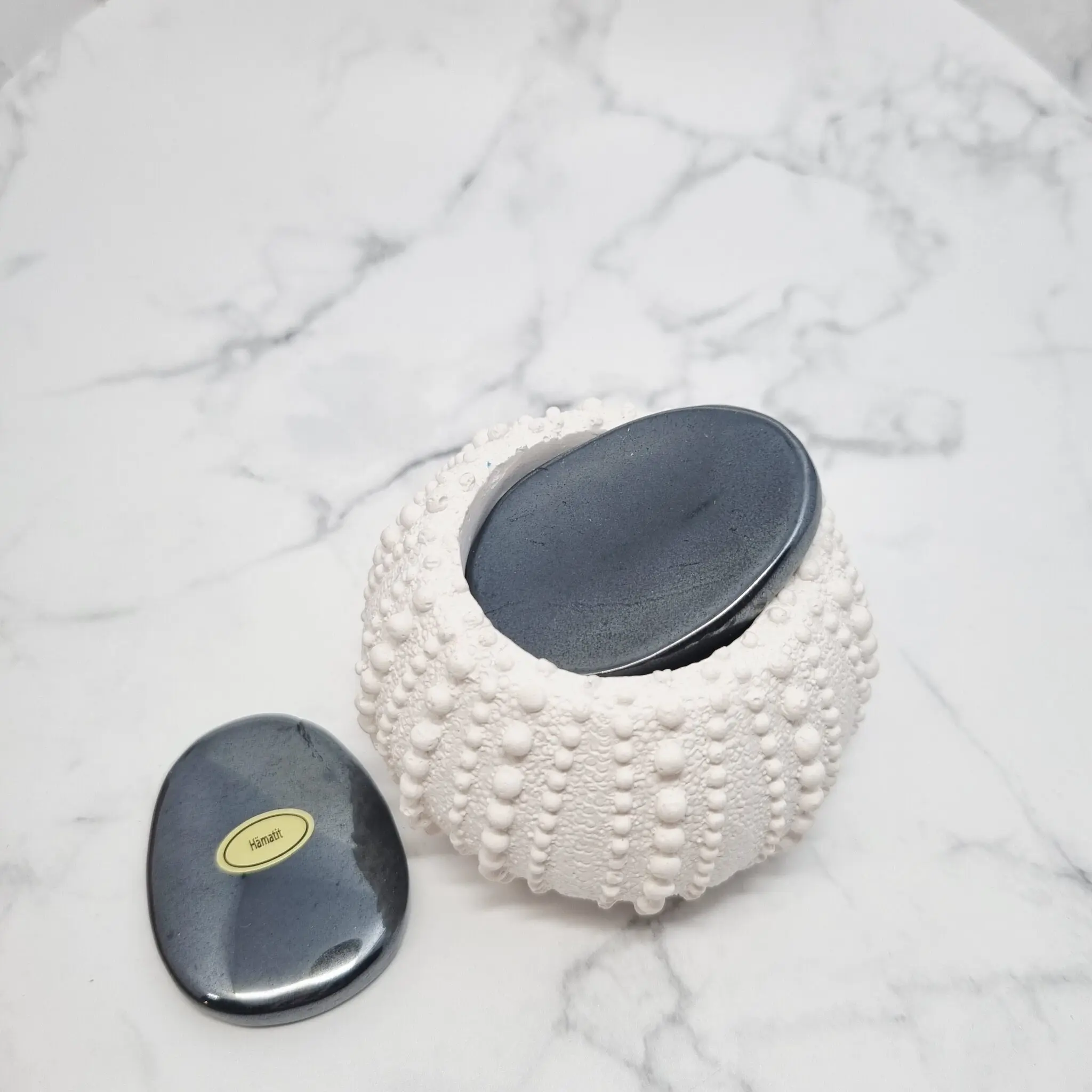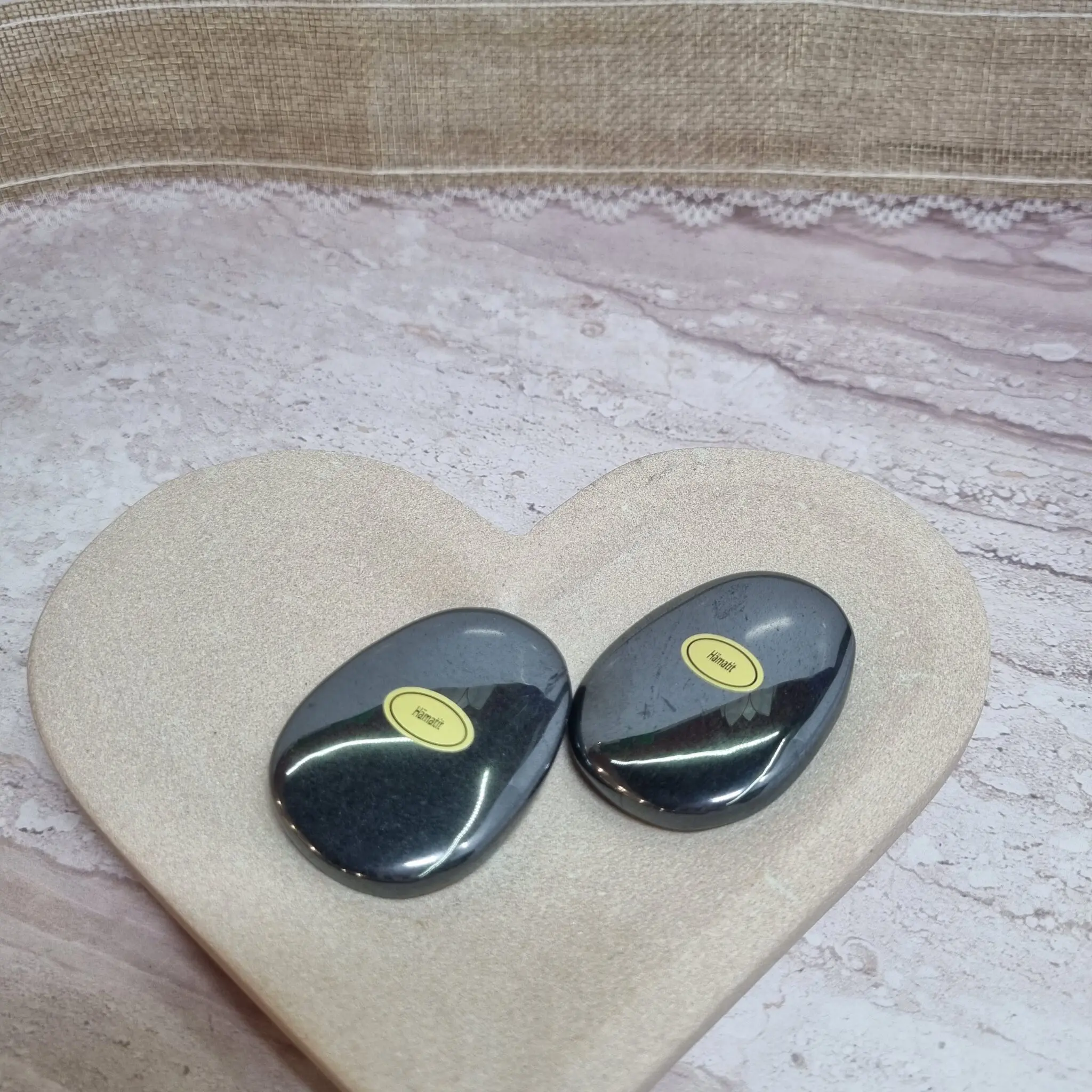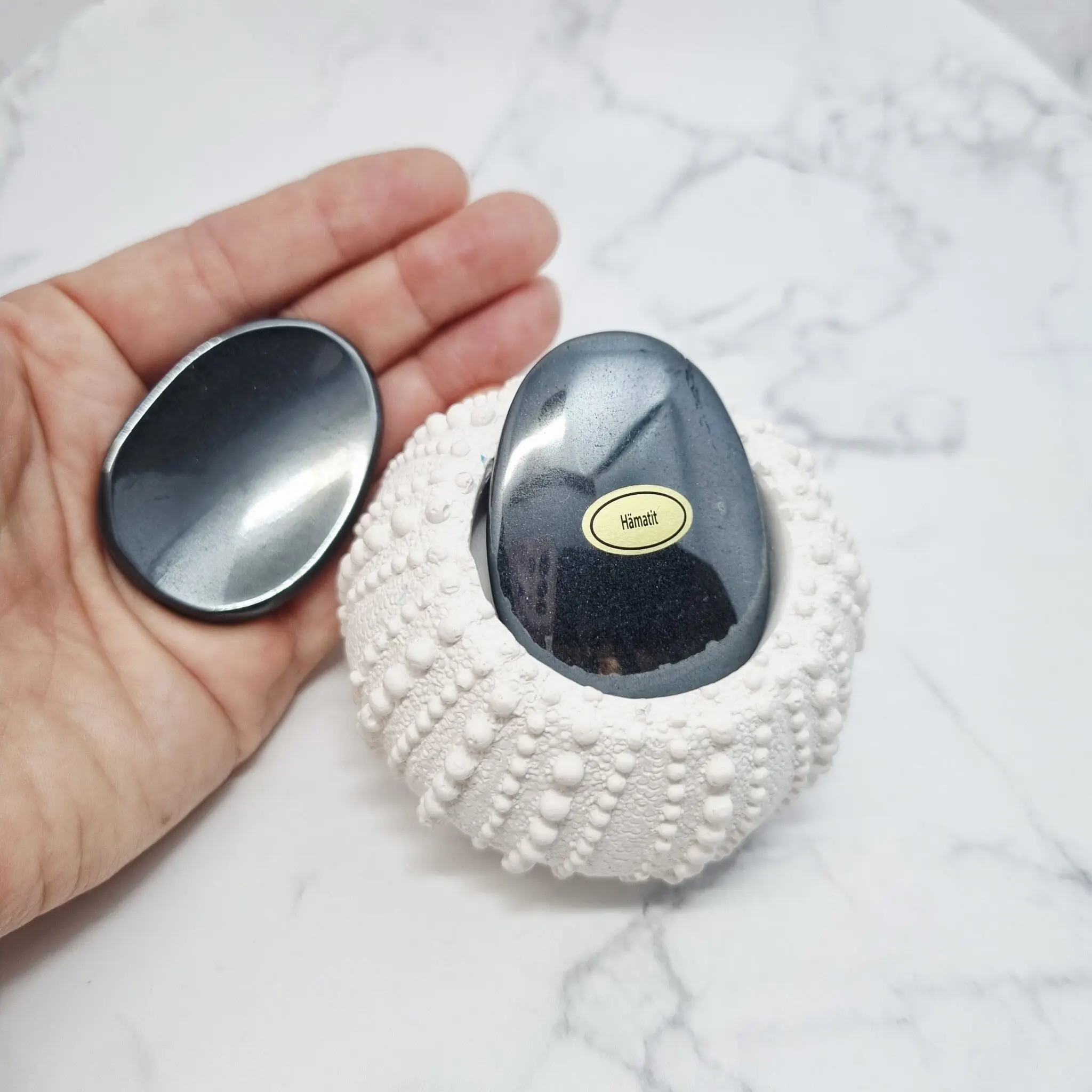 Ti čudoviti kamni hematita so oblikovani v gladke, ovalne oblike, ki se popolnoma prilegajo v dlan – kot nalašč za to, da jih držite in gladite, ko potrebujete trenutek miru. Njihova barva je globoka, sijoča kovinsko siva, ki se v določenih kotih sveti s čudovitim, skoraj zrcalnim leskom. Površina je neverjetno gladka in prijetna na dotik, kar dodatno poudarja občutek spokojnosti, ko jih držite.