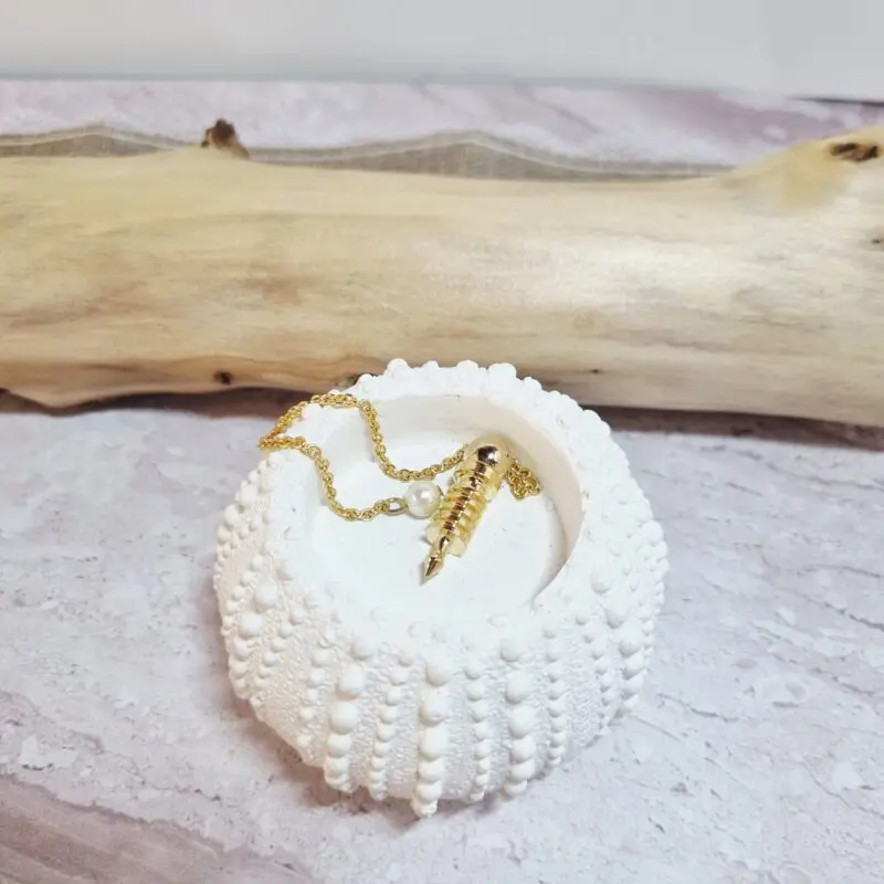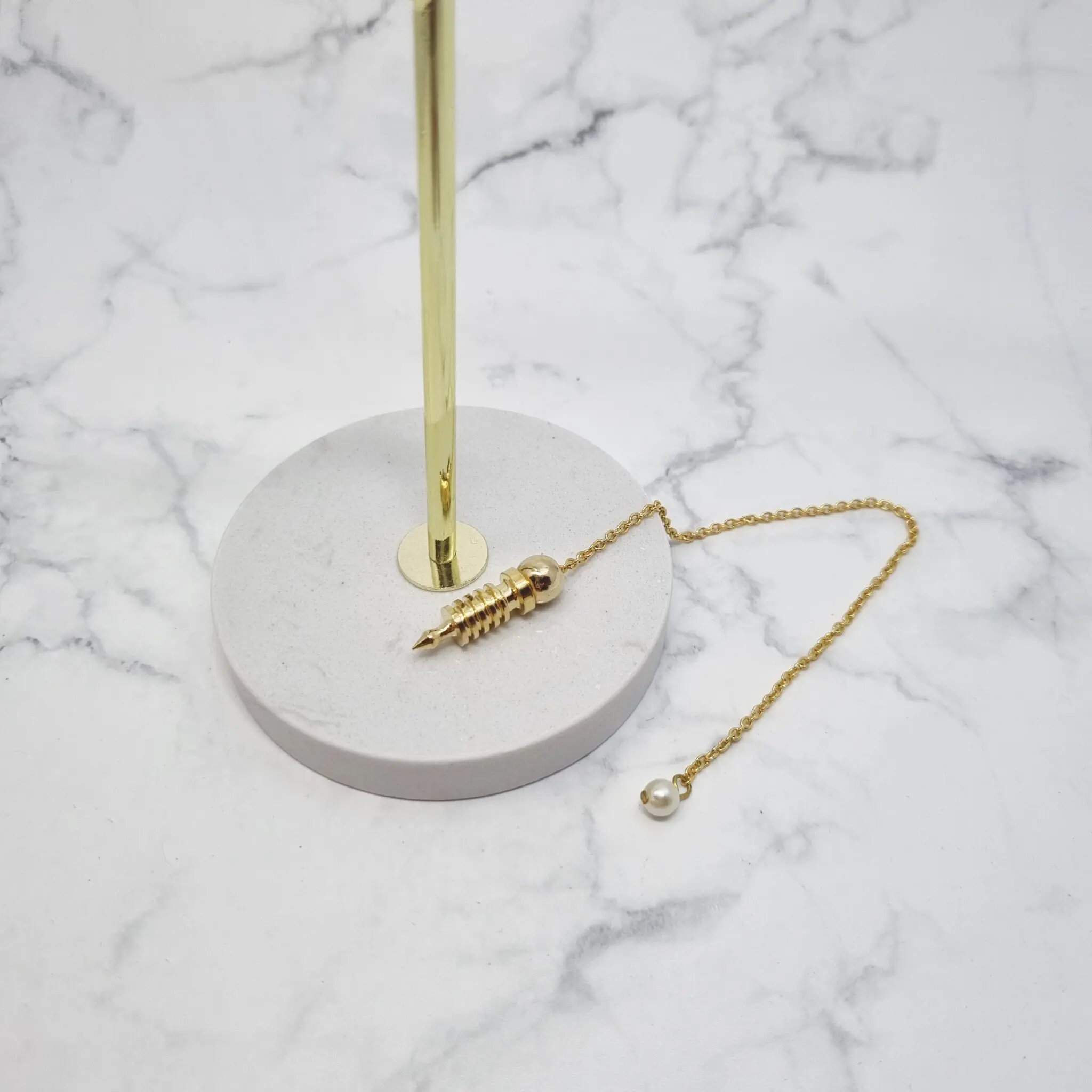 To izjemno nihalo Izis, izdelano iz medenine, sije v čudovitem, toplem zlatem odtenku. Njegova oblika je prepoznavna po močni, cilindrični zasnovi, ki se proti koncu postopoma zožuje v ostro konico. Telo nihala krasijo natančno izrezljani in simetrično razporejeni obroči, ki mu dodajo tako teksturo kot vizualno bogatost. Na vrhu se zaključi z manjšo, elegantno kroglico, na katero je pritrjena fina, a trpežna verižica, prav tako v sijoči zlati barvi. Celoten videz je skladen, eleganten in vzbuja občutek prefinjenosti ter mojstrstva.