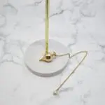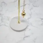 Nihalo kapljica iz medenine je izjemno eleganten kos. Njegova glavna komponenta je sijoča, zlata medeninasta kapljica, ki se zdi, kot bi bila ulita iz tekočega sonca. Njena površina je gladka in polirana, kar ustvarja čudovit sijaj in odboj svetlobe. Na vrhu kapljice se nahaja majhno, minimalistično uho za pritrditev, iz katerega se spusti tanka, a močna zlata verižica. Na koncu verižice je pritrjen majhen, svetel bel biser, ki dodaja pridih elegance in prefinjenosti. Celoten videz je preprost, a hkrati izjemno bogat in prefinjen, poudarjajoč klasično lepoto materialov in oblike.