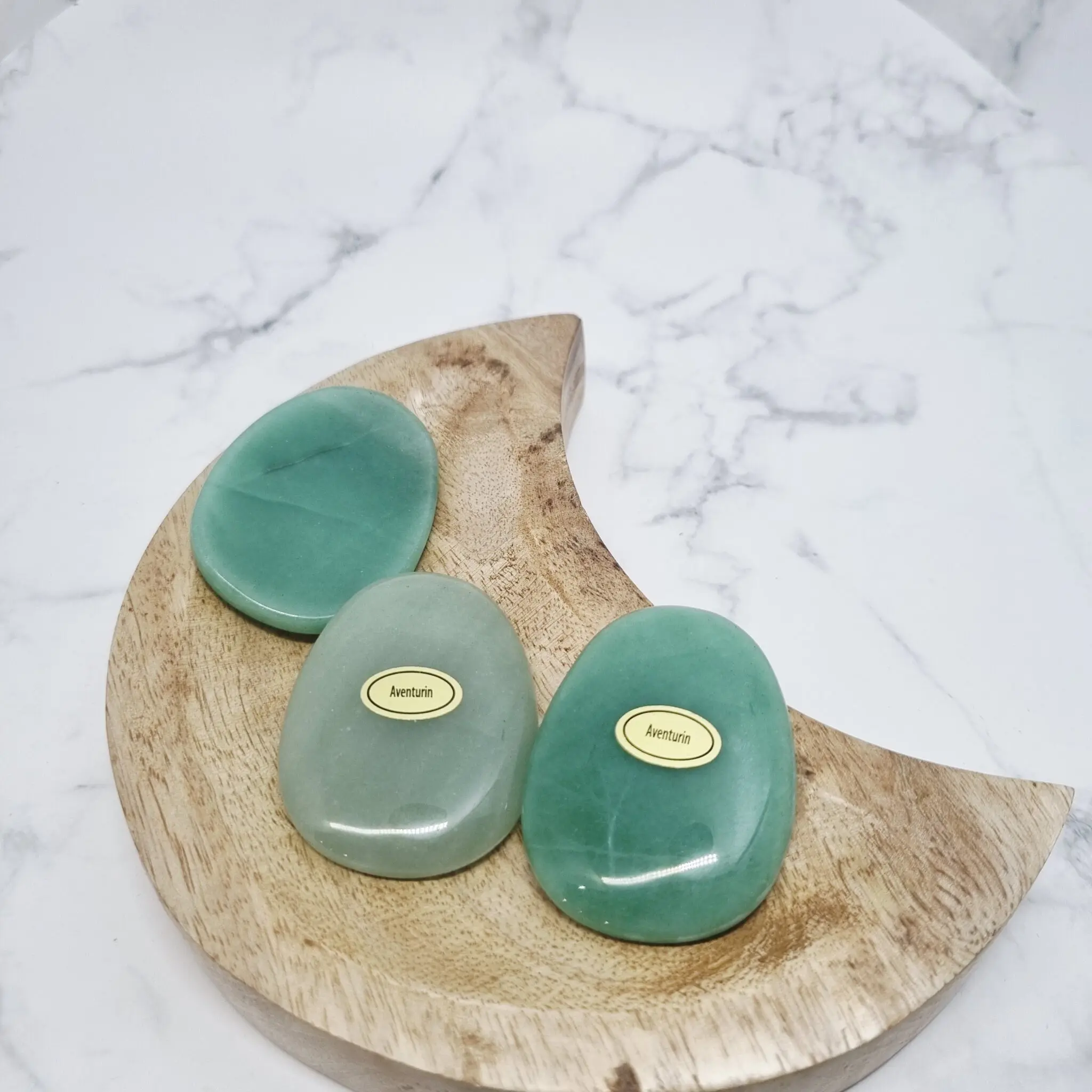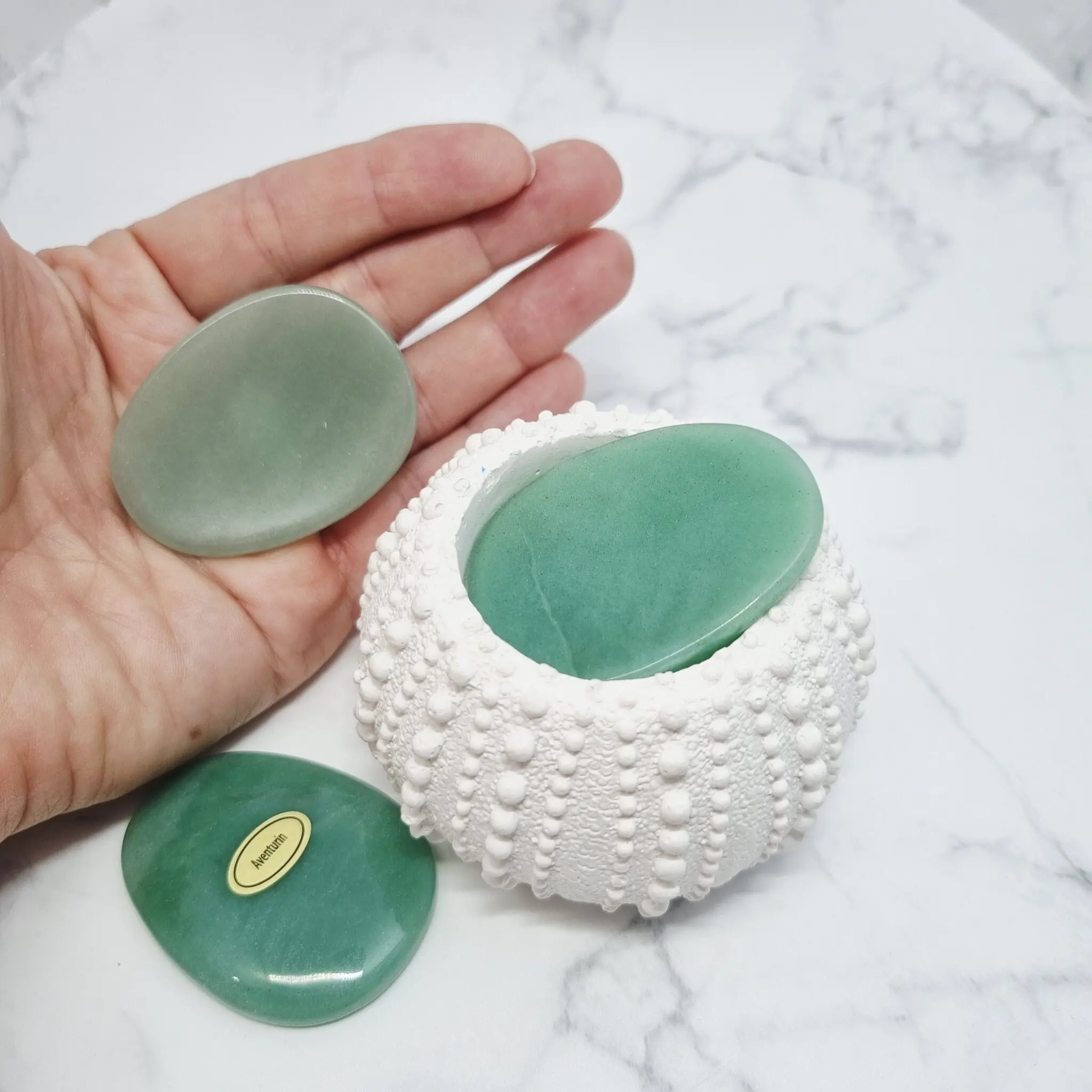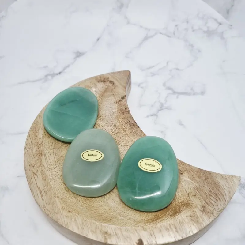 Ti aventurinski kamni za pomiritev so izjemno taktilni in vizualno privlačni. Vsak kamen je čudovito zelen, barva narave in obnove, z nežnimi, prosojnimi odtenki, ki se prepletajo in ustvarjajo globino. Gladka, polirana tekstura je izjemno prijetna na dotik, kar omogoča, da kamen drsi med prsti in s tem olajša sproščanje napetosti. Oblikovani so kot zaobljeni ovali, popolni za udoben oprijem v dlani, kar je idealno za uporabo kot kamen za pomiritev. Občasno lahko vidite tudi drobne vključke, ki pričajo o njegovem naravnem izvoru in pristnosti.