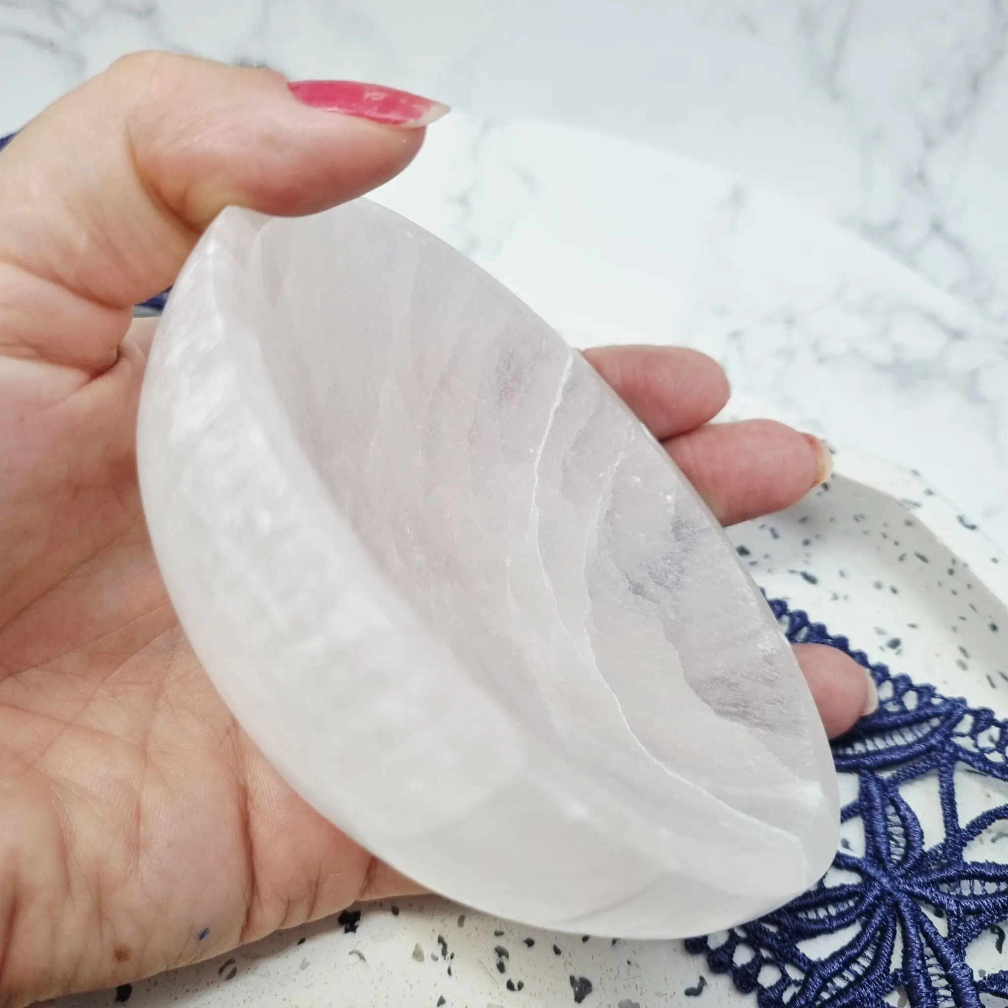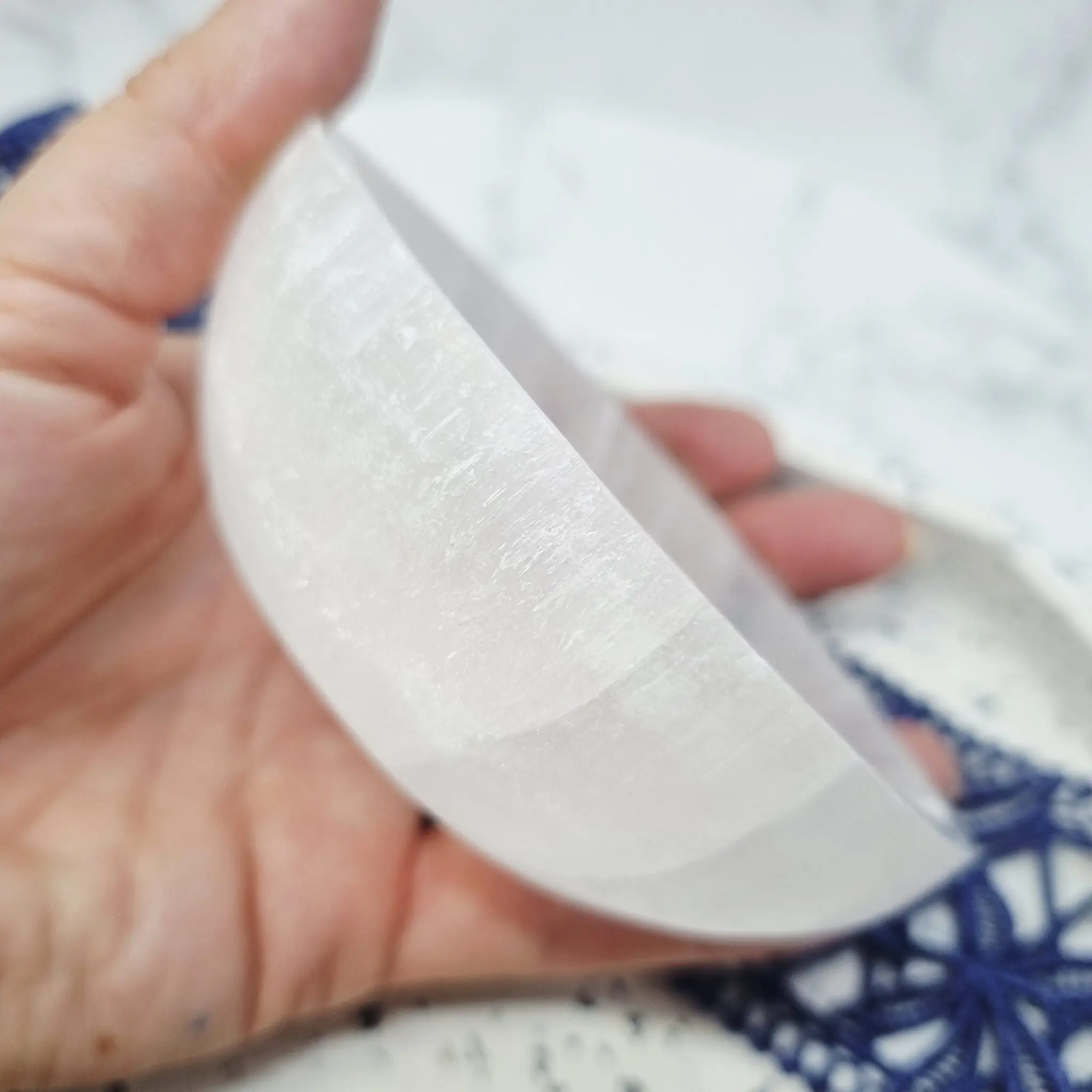 Ta čudovita selenit posodica je oblikovana kot majhna, plitva okrogla skodelica z rahlo nagnjenimi stranicami. Njena barva je čista, prosojna, mlečno bela, skozi katero se ob določeni svetlobi lahko prebijajo subtilni, biserni odtenki in odsevi. Tekstura je prepoznavno selenitna, z nežnimi vdolbinami in naravnimi vzorci, ki spominjajo na pernate ali vlaknate strukture, kar dodaja občutek mehkobe in organskosti. Notranjost posodice je gladko polirana, medtem ko so zunanje površine lahko nekoliko bolj teksturirane, kar poudarja njeno naravno lepoto. Zaradi svoje prosojnosti lahko skozi posodico svetloba preide, kar ustvarja nežen sijaj in poudarja naravne sloje kamna. Zaradi svoje relativno nevtralne barve se lepo dopolnjuje z barvami kristalov, ki jih vsebuje.