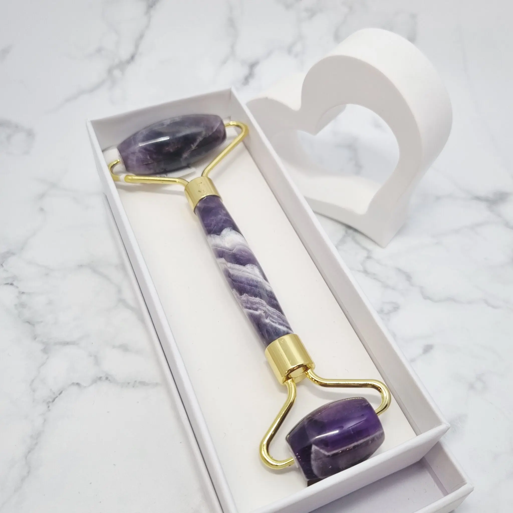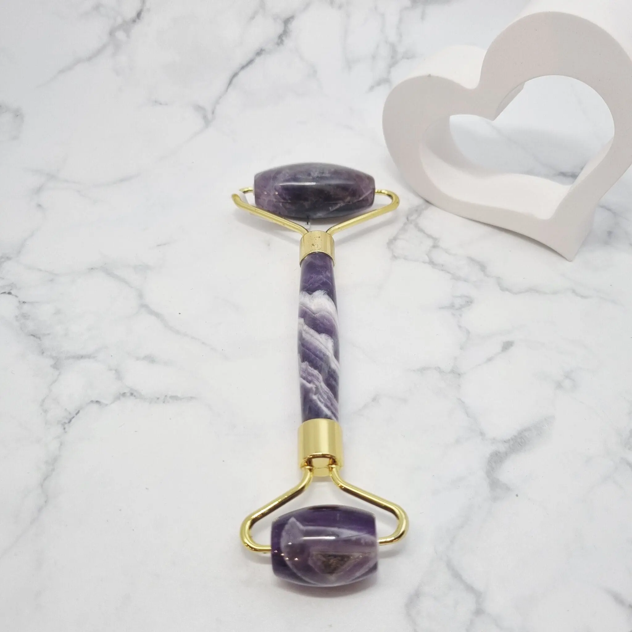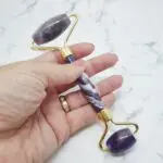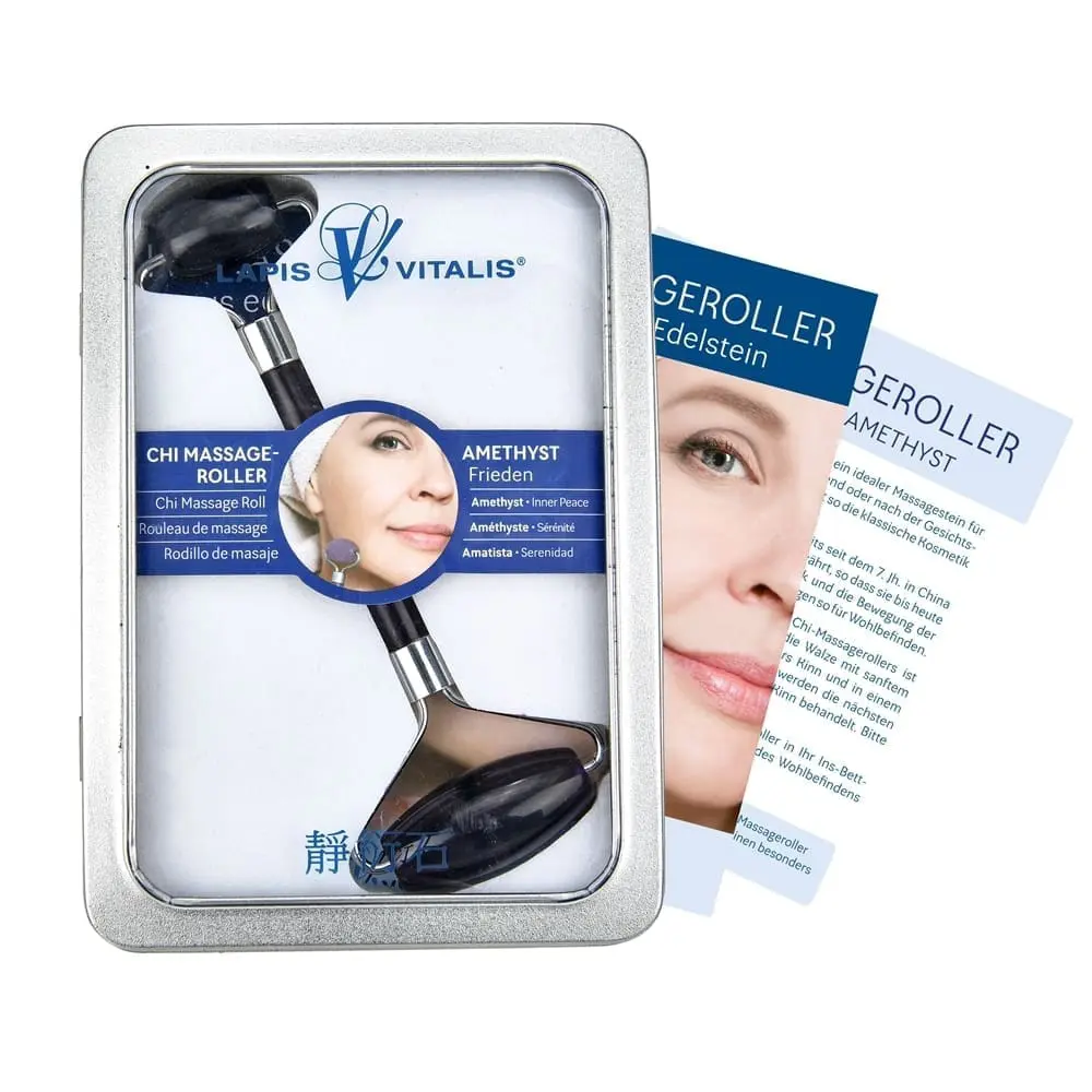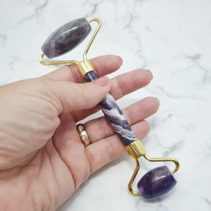 Ametist je izjemno pomirjujoč kamen, ki je močno povezan s kronsko čakro (Sahasrara) in čakro tretjega očesa (Ajna). S stimulacijo teh centrov pomaga pri sproščanju napetosti, izboljšuje intuicijo in spodbuja duhovno jasnost. Na fizični ravni se verjame, da ametist pomaga pri blaženju glavobolov in izboljšanju kakovosti spanca, s tem pa pripomore k splošnemu občutku umirjenosti in ravnovesja. Uporaba valjčka na koži lahko spodbudi prekrvavitev, zmanjša otekline in pomaga pri boljšem vpijanju učinkovin iz negovalnih izdelkov, kar koži prinese zdrav in sijoč videz.