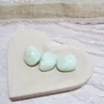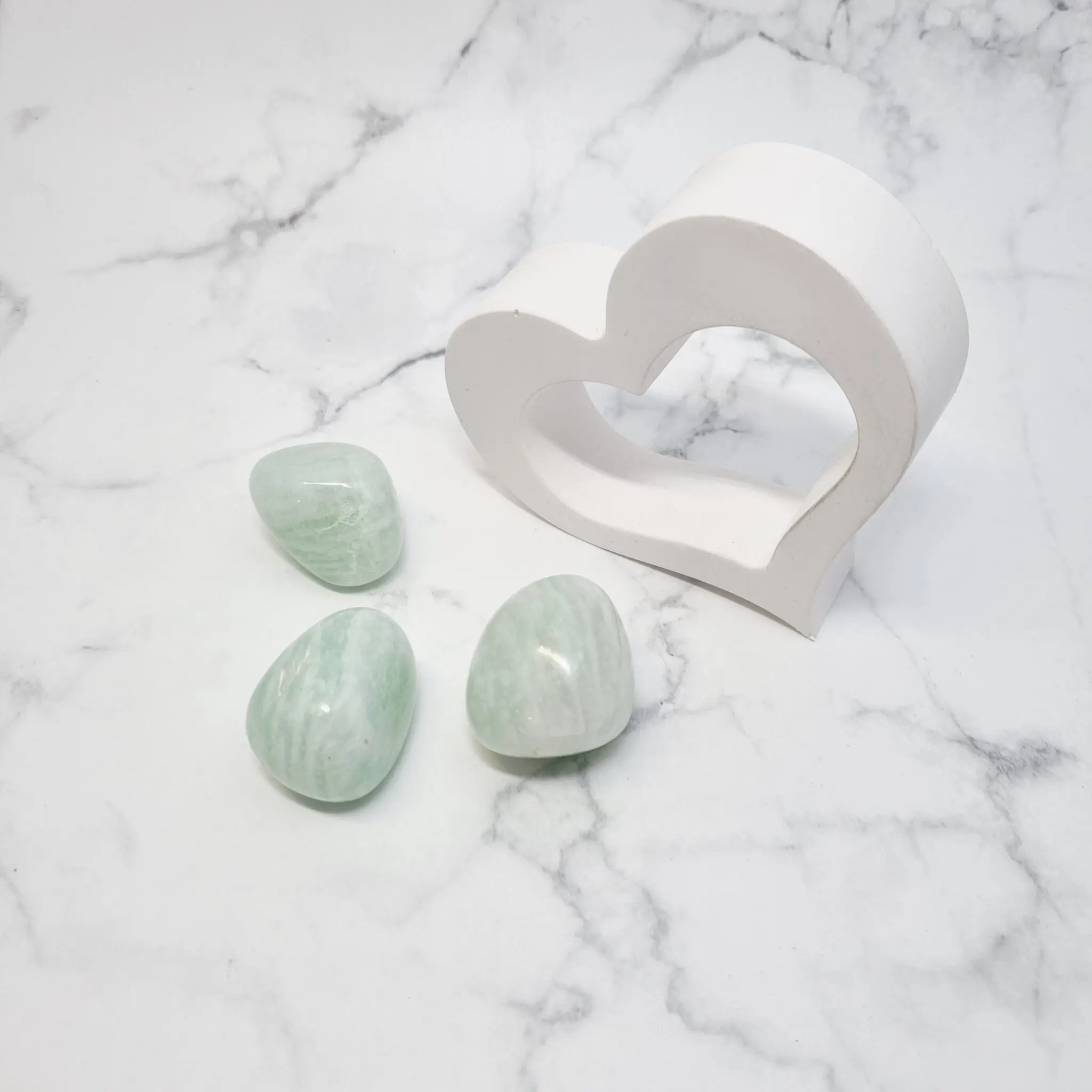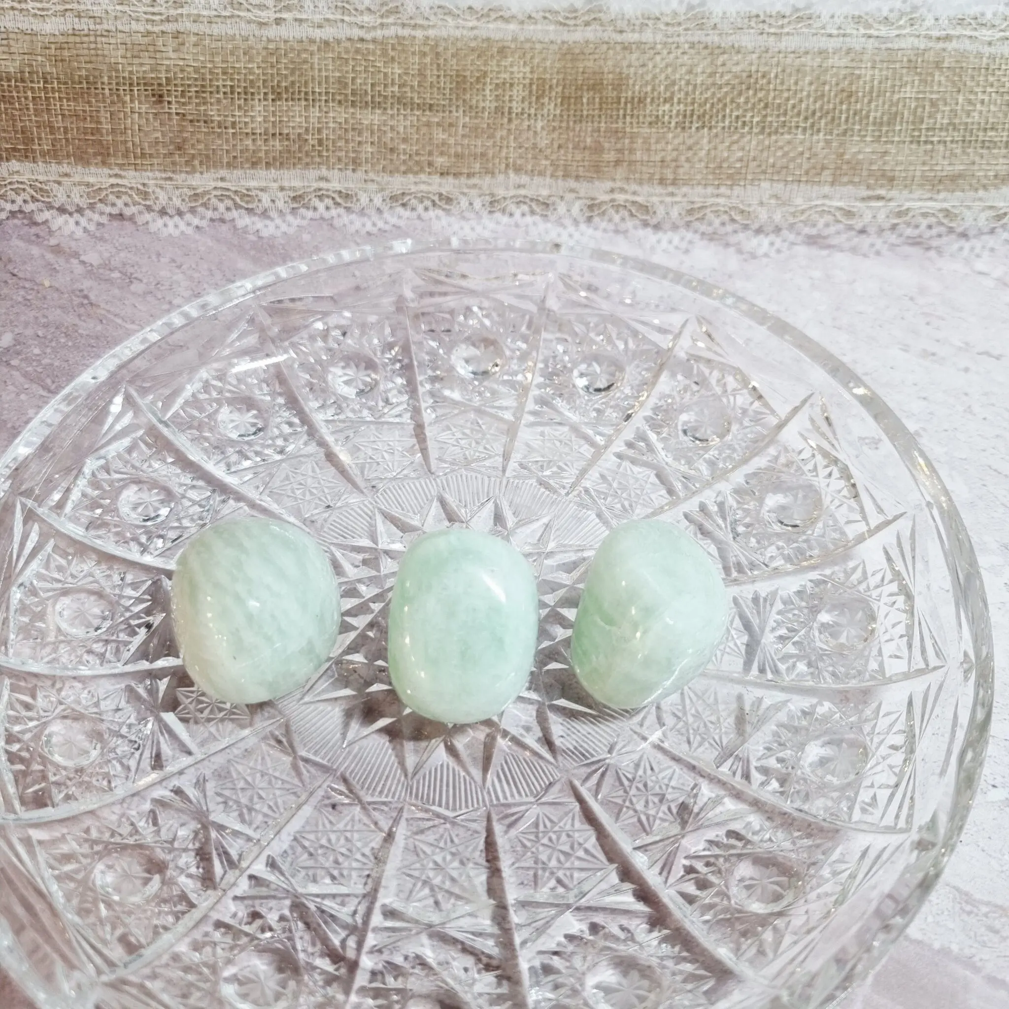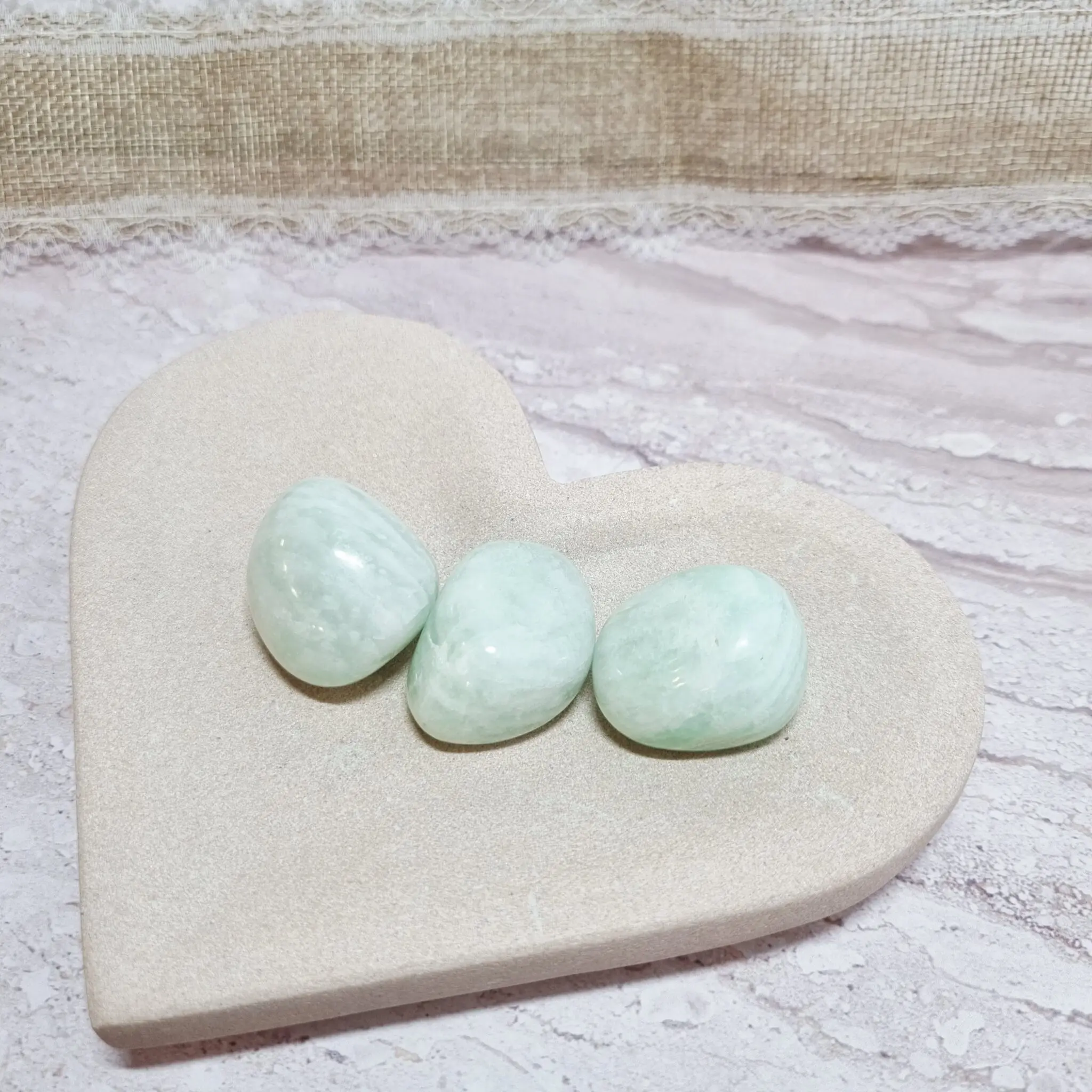 Ti prefinjeni koščki amazonita se ponašajo z nežnimi, svetlo zelenimi do turkiznimi odtenki, ki spominjajo na tropske lagune. Vsak kamen je čudovito obdelan, da poudari njegovo gladko in sijočo površino, ki prijetno drsi pod prsti. Na nekaterih kamnih lahko opazite tudi nežne bele proge, ki dodajo globino in edinstvenost. Njihova oblika je zaobljena in polirana, kar jih dela popolne za nošenje v žepu, posteljo ali pa preprosto za občudovanje.