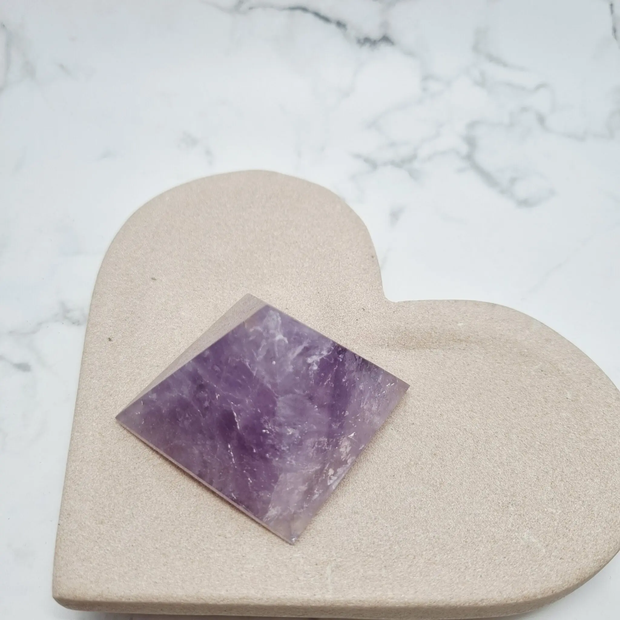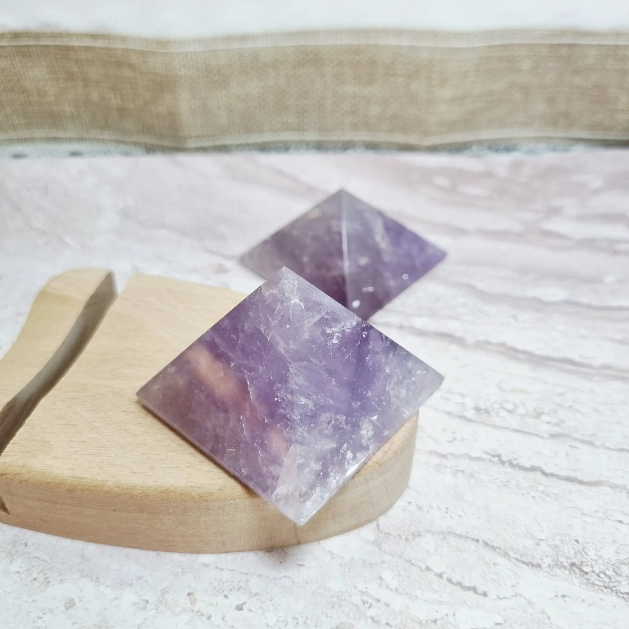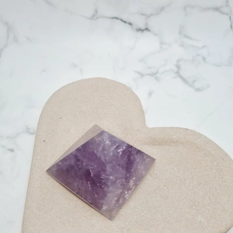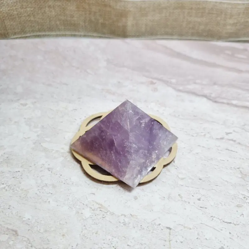 Ta čudovita piramida je izklesana iz naravnega ametista, s prelepimi niansami vijolične barve, ki se gibljejo od svetlejše sivkasto vijolične do bogatih, globljih odtenkov. Na nekaterih mestih lahko opazite nežne bele proge, ki poudarjajo naraven značaj kamna. Oblika piramide v kristalnem svetu velja za močan ojačevalec energije, saj usmerja in fokusira univerzalno življenjsko energijo na eno točko, kar je idealno za meditacijo in uravnoteženje prostora.