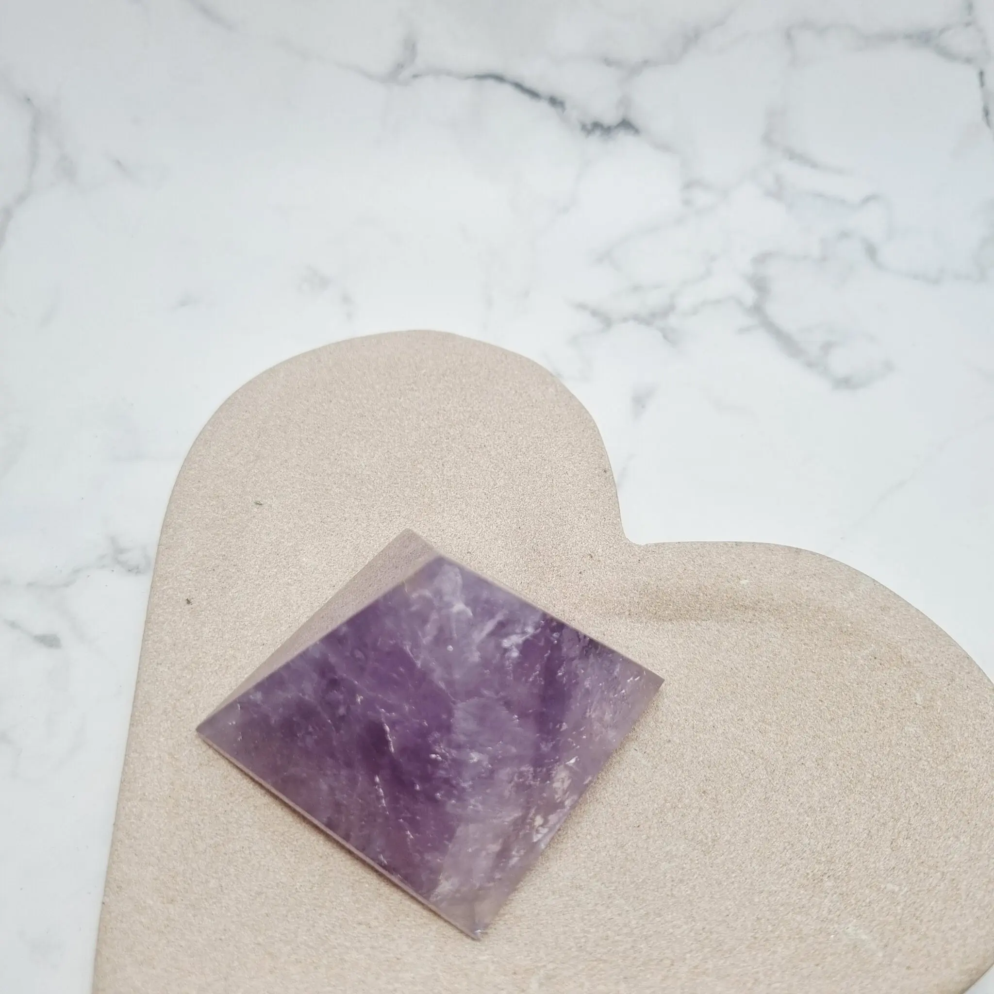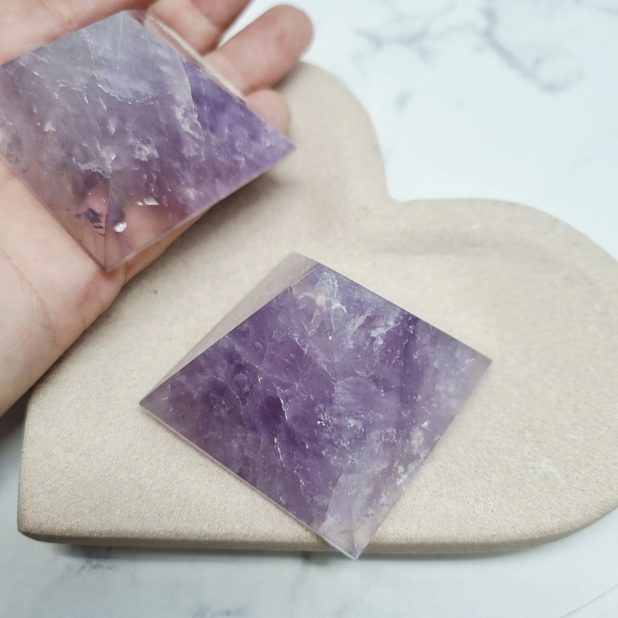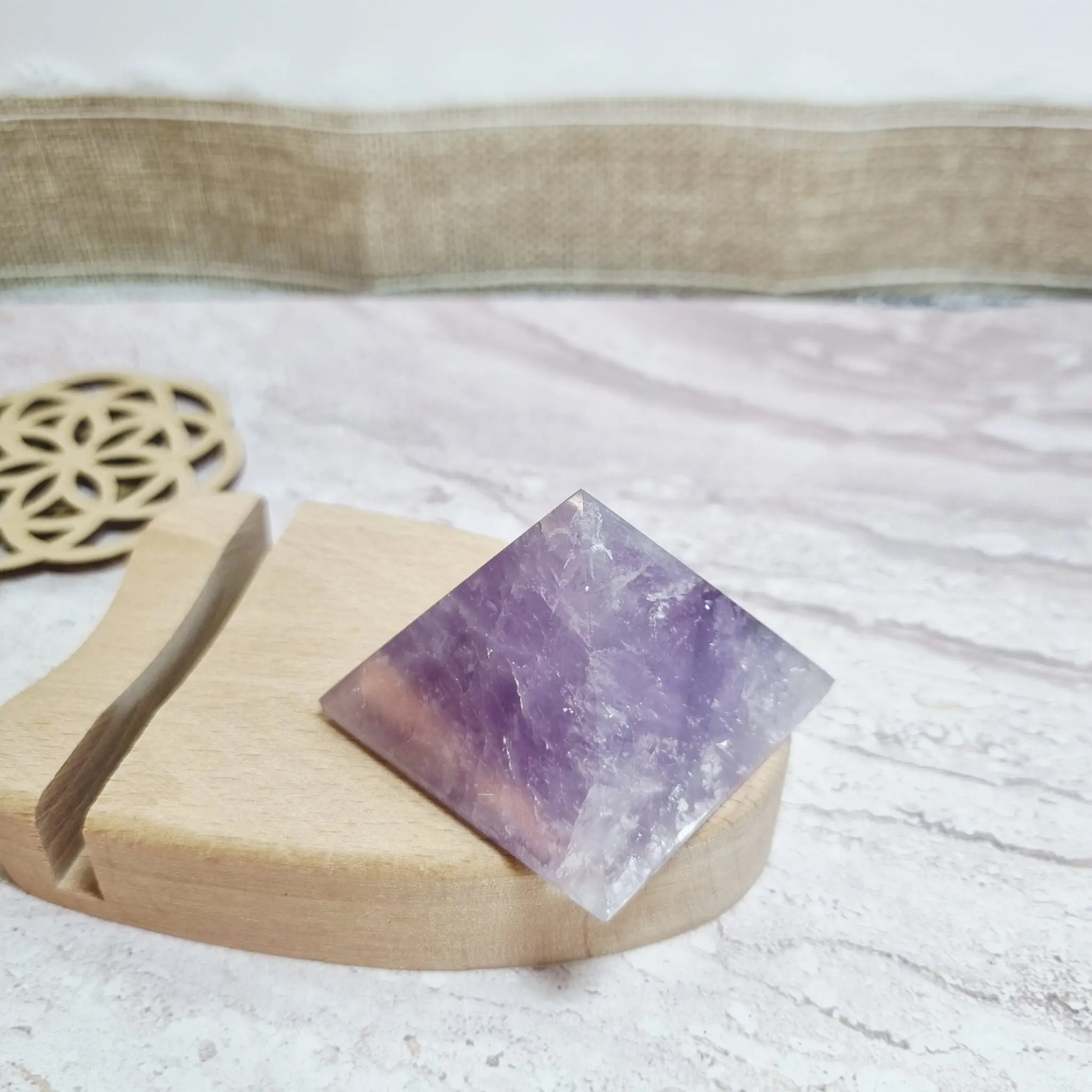 Ta čudovita piramida je izklesana iz naravnega ametista, s prelepimi niansami vijolične barve, ki se gibljejo od svetlejše sivkasto vijolične do bogatih, globljih odtenkov. Na nekaterih mestih lahko opazite nežne bele proge, ki poudarjajo naraven značaj kamna. Oblika piramide v kristalnem svetu velja za močan ojačevalec energije, saj usmerja in fokusira univerzalno življenjsko energijo na eno točko, kar je idealno za meditacijo in uravnoteženje prostora.