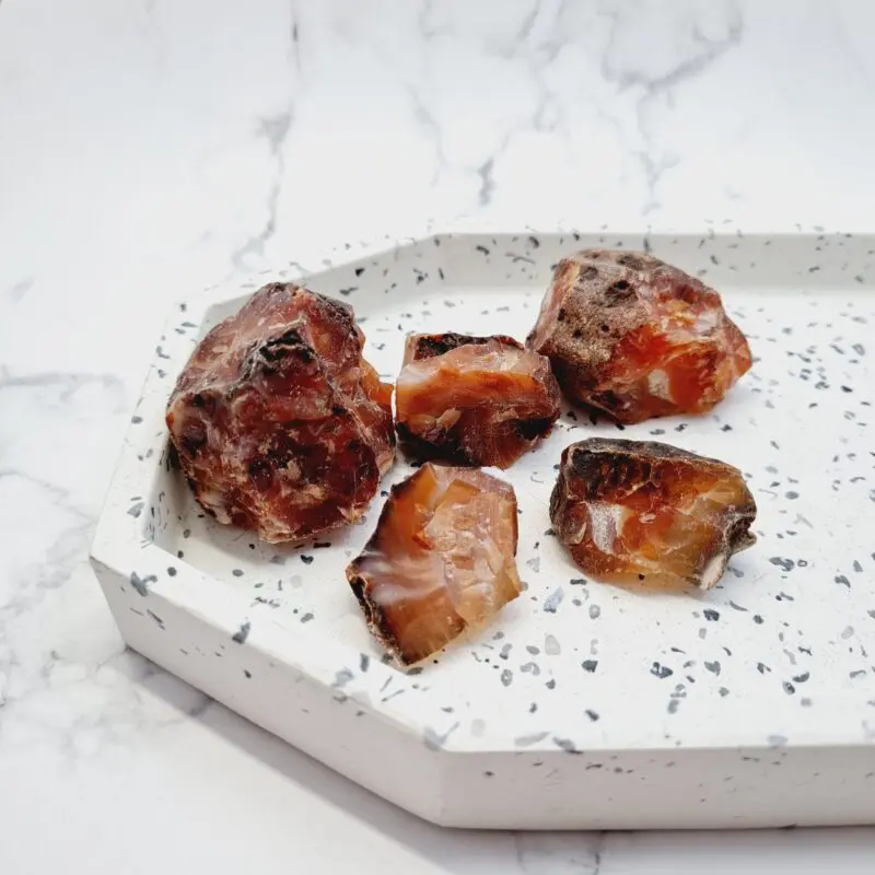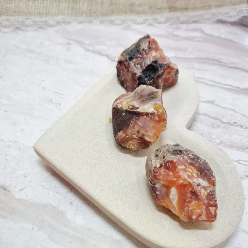 Ti kosi karneola se ponašajo s čudovitimi, neenakomernimi oblikami, ki poudarjajo njihovo naravno lepoto. Prevladujejo bogati odtenki oranžno-rjave in rdeče, ki spominjajo na jesenske liste in žareč sončni zahod. Nekateri kamni imajo tudi temnejše lise, ki dodajo globino in edinstven značaj, medtem ko drugi razkrivajo bolj prosojne dele, ki se lesketajo v svetlobi. Njihova površina je večinoma hrapava in naravna, kar priča o njihovem izvoru, a hkrati ponuja zanimivo taktilno izkušnjo.