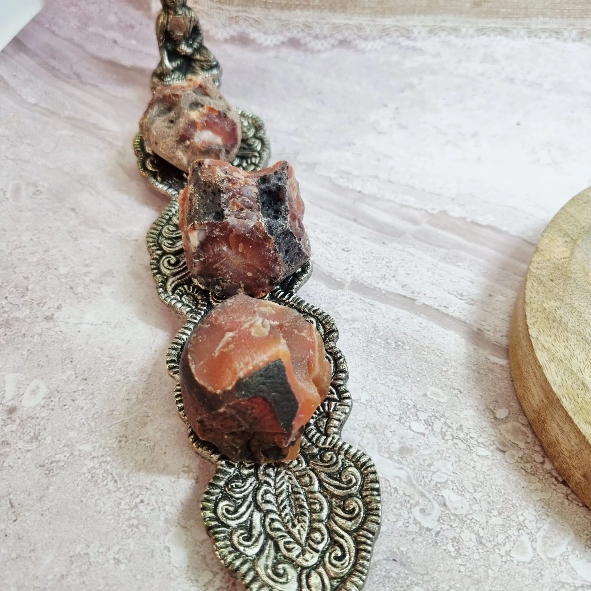 Karneol je močno povezan s korensko in sakralno čakro, kar pomaga pri prizemljitvi in spodbujanju kreativnosti. Njegova energija podpira reproduktivne organe in vitalnost, obenem pa krepi pogum in samozavest. Verjamem, da nam pomaga premagovati strahove in nas opogumlja, da sledimo svojim sanjam, saj sem sama s pridom izkoriščala njegovo moč, ko sem se učila postavljati meje in se postavila zase.
