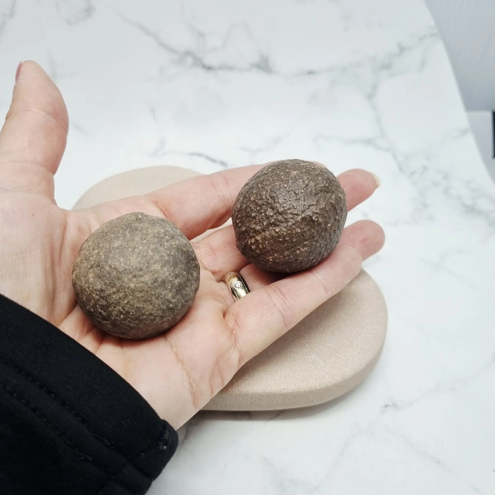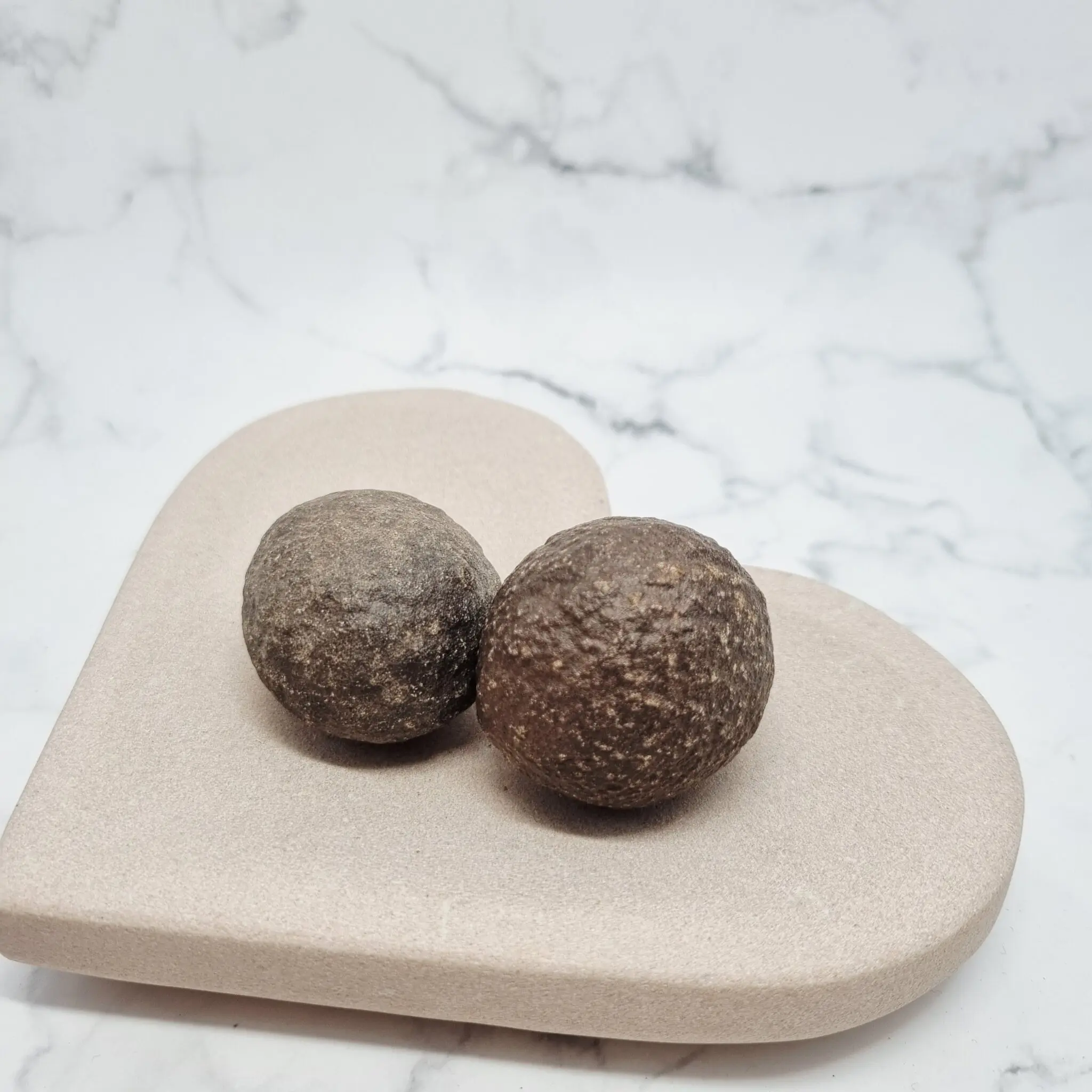 Te Moqui marble kroglice so čudovito zemeljske in pristne. Njihova barva se giblje v toplih odtenkih temno rjave do sivkasto rjave, kar spominja na barve suhe zemlje ali prastarega lesa. Površina kroglic je groba, teksturirana in rahlo hrapava, kar jim daje pristen, naraven in nedotaknjen videz. So okrogle oblike, vendar ne popolnoma simetrične, kar poudarja naravno oblikovanje skozi milijone let. Vsaka kroglica je unikatna, z lastnimi manjšimi nepravilnostmi in gubicami, ki pripovedujejo zgodbo o njenem nastanku in potovanju. Ko jih držite v roki, čutite njihovo trdnost in težo, kar ustvarja občutek robustne zemeljske prisotnosti.