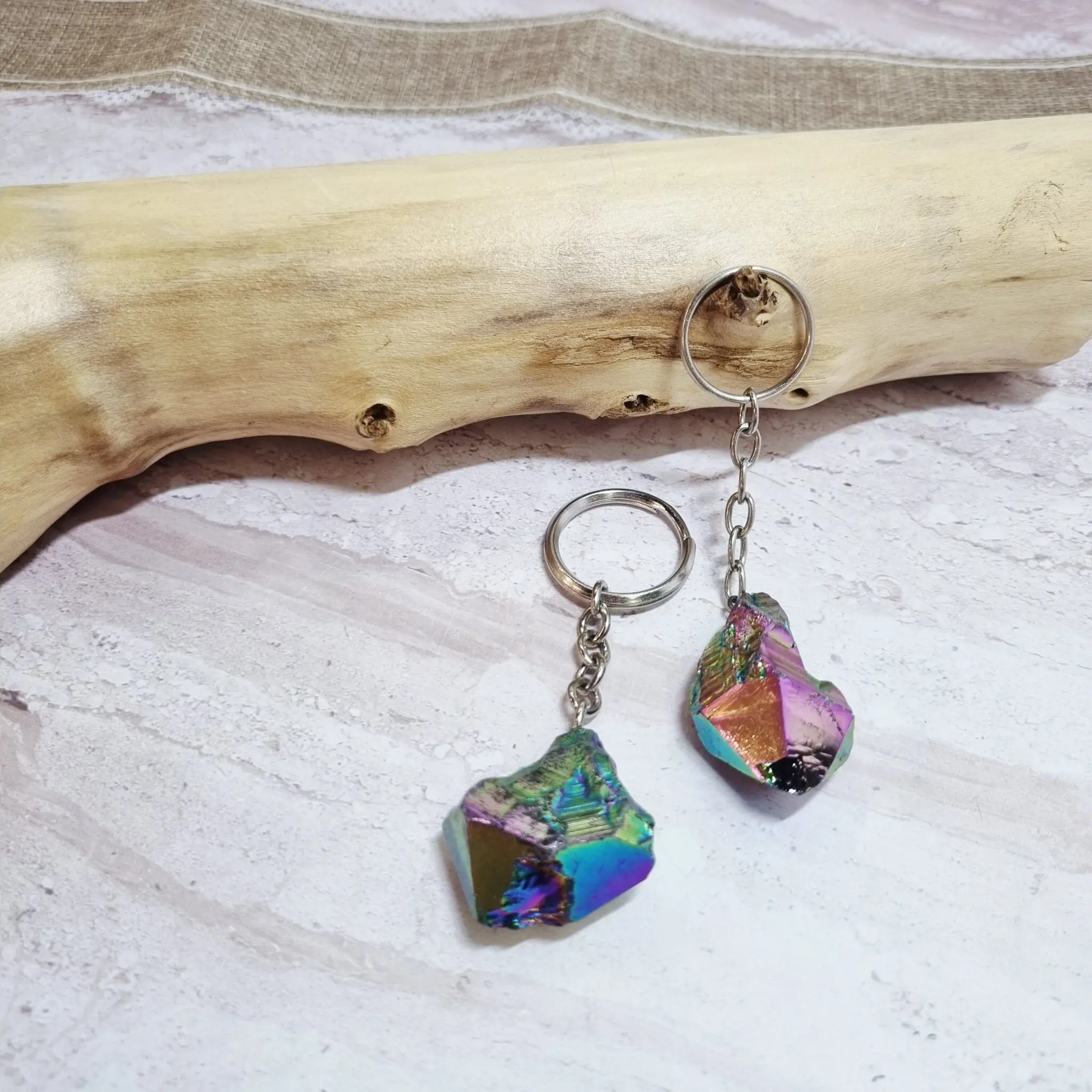 Izjemno privlačen obesek za ključe Titan aura krasi obdelan kos prozornega kvarca, ki se ponaša z značilno sijočo, mavrično površinsko obdelavo. Ta obdelava mu daje fascinanten lesk, ki spominja na barvne odtenke, ki se prelivajo po površini, ko se svetloba odbija od njega. Oblika kristala je podolgovata, stožčasta in rahlo nepravilna, kar poudarja njegovo naravno lepoto. Vsak kristal je edinstven, nekateri so bolj transparentni, drugi pa imajo značilne notranje vključke. Kristal je pripet na enostaven, a vzdržljiv kovinski obroček s povezovalno verižico, kar omogoča enostavno pritrditev na ključe ali torbico. Barvna paleta kristala je predvsem svetla, prelivajoča se med prozorno belo in subtilnimi mavričnimi odtenki ob pravilni svetlobi.