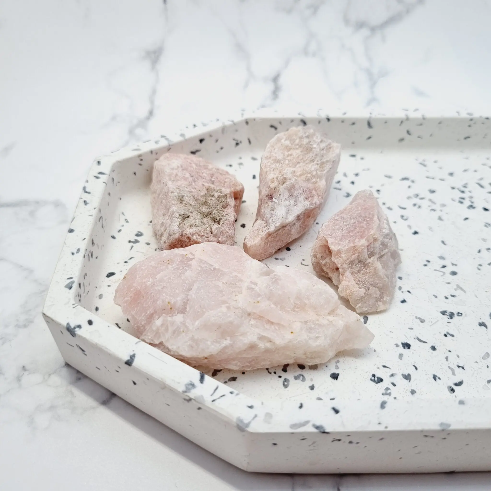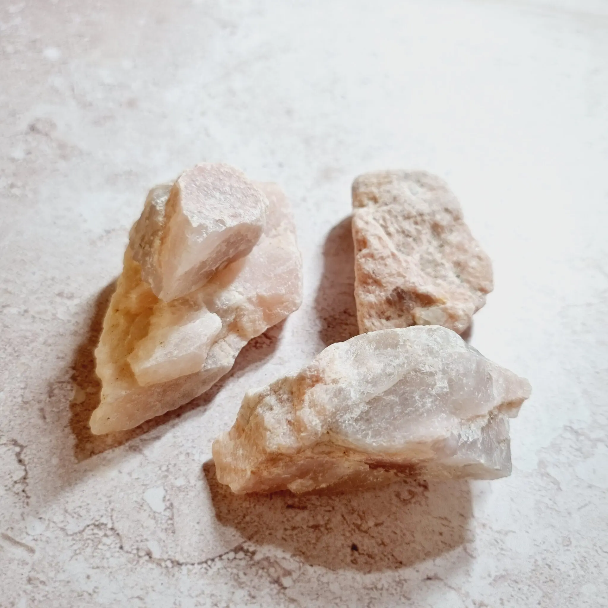 Ti surovi minerali petalita so naravne oblike, ki se gibljejo od pretežno rožnatih, skoraj belih odtenkov do bolj kremastih in bledo oranžnih tonov. Vsak kos je neobdelan, kar poudarja njegovo naravno teksturo in edinstvene zareze, ki so nastale skozi milijone let. Površina je pogosto nekoliko hrapava in mat, kar daje občutek pristnosti in povezanosti z naravo. Nekateri kosi lahko kažejo rahlo prosojnost, kar le še poudarja njihovo eterično lepoto.