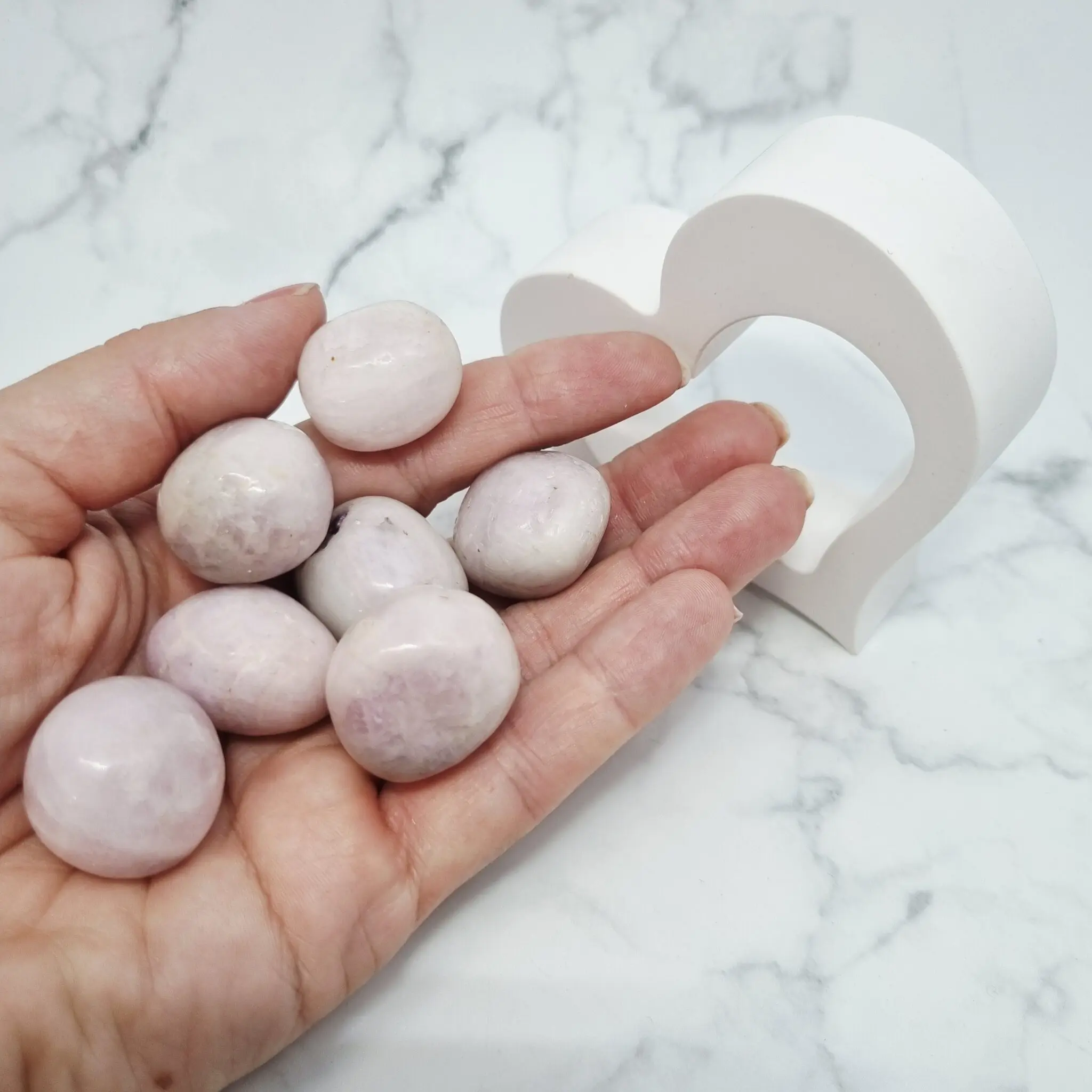 Ti čudoviti polirani kunziti so ovalne do nepravilne oblike, z nežnimi zaobljenimi robovi, ki se popolnoma prilegajo v dlan ali žep. Njihova barva se giblje od izjemno nežne, skoraj prosojne svetlo rožnate, do bolj intenzivnih odtenkov sivkasto rožnate, nekateri kosi pa imajo celo subtilne rjavkaste ali sivkaste lise, ki poudarjajo njihovo naravno, neponovljivo teksturo. Površina je gladka in sijajna, kar omogoča, da svetloba nežno lomi in razkriva notranje odtenke. Vsak kamenček je edinstven, kar priča o umetnosti narave, ki jih je ustvarila.