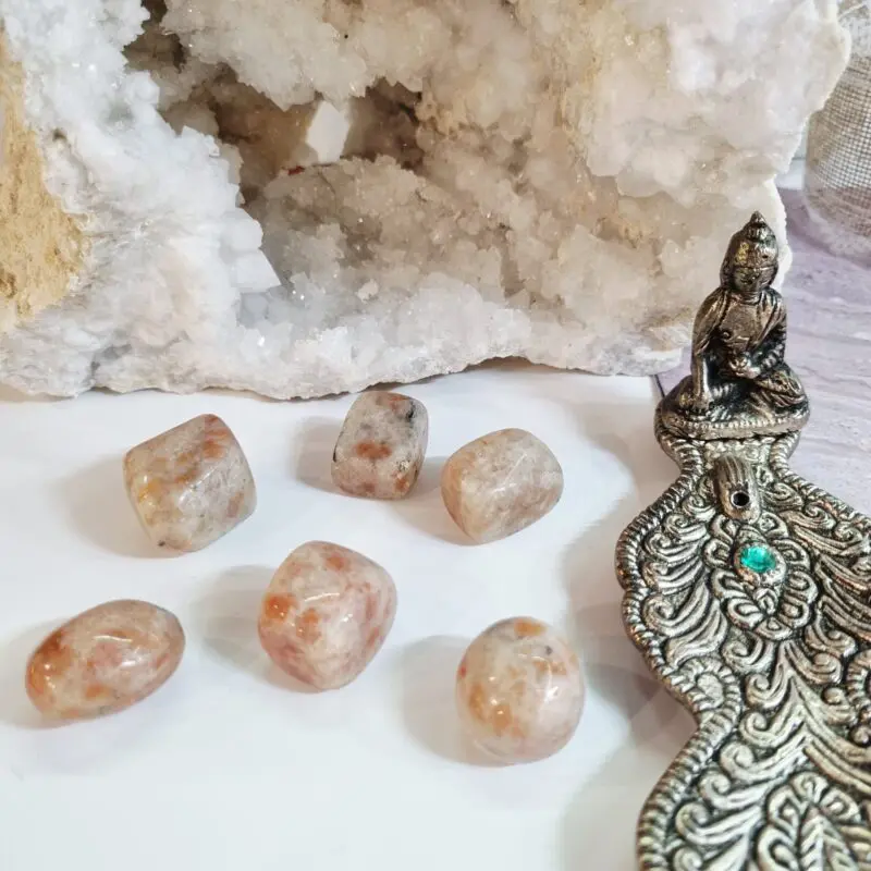 Ti polirani sončni kamni so izjemno privlačni. Njihove barve se gibljejo od nežnih, prosojnih odtenkov smetanasto bele in svetlo marelične do globljih, intenzivnih oranžno-rdečih tonov. Vsak kamen prikazuje edinstvene rdečkasto-oranžne sijaje, ki spominjajo na iskrice sonca, ujetega v mineralu, še posebej, ko se svetloba dotakne njihove površine. So gladki na otip, polirani do sijočega zaključka, kar jih dela popolne za držanje v dlani ali nošenje v žepu. Nekateri kosi imajo tudi drobne temnejše vključke, ki dodajo značaj in globino njihovi že tako bogati barvni paleti.