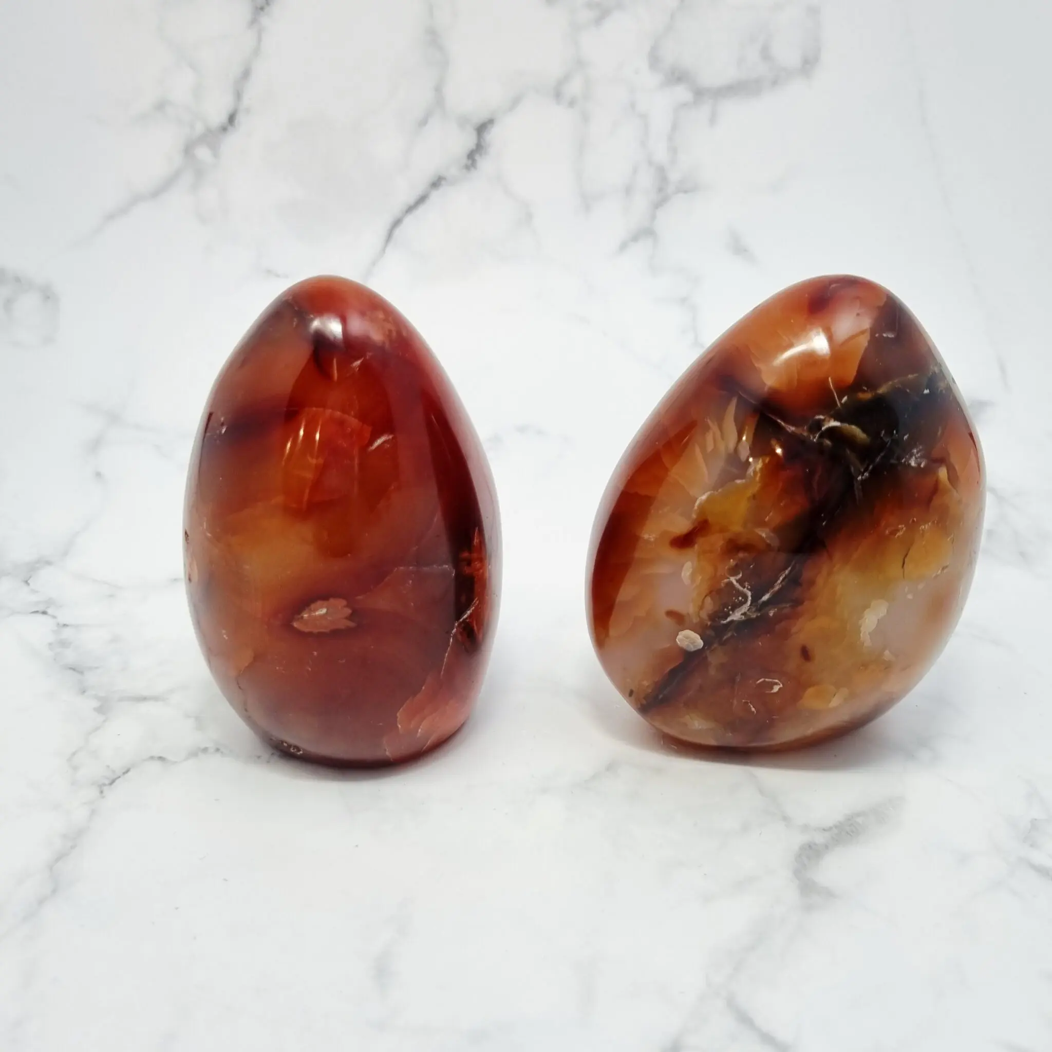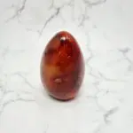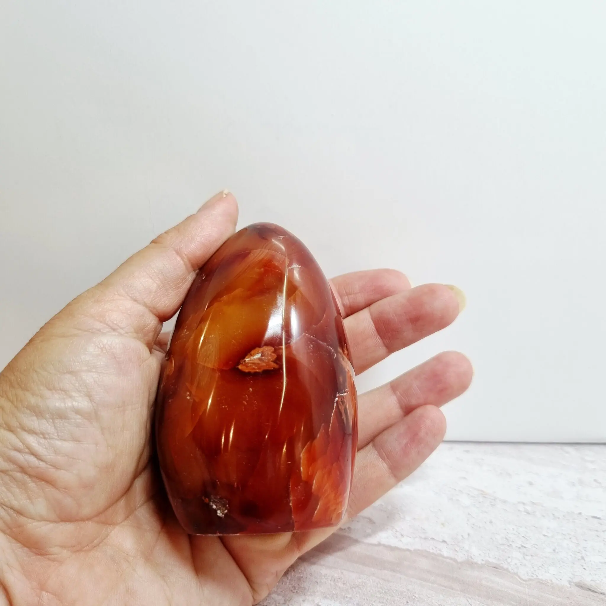 Ti čudoviti stožci karneola so pravi praznik za oči. Njihova barvna paleta se giblje od globokih, rdečkasto-oranžnih tonov, ki spominjajo na jesensko listje in žgočo žerjavico, do svetlejših odtenkov rjave in rumenkasto-bele. Nekateri kosi prikazujejo tudi prosojnost, ki razkriva notranje vzorce in “oblačke” v kristalu, dodajajočim globino in značaj. Površina je gladko polirana in sijoča, kar poudarja bogate barve in tople odtenke. Vsak stožec je edinstven, s svojimi lastnimi naravnimi niansami in prelivanjem barv, ki pričajo o njegovem zemeljskem izvoru. Kar jaz vedno rečem, “vsak kos ima svojo zgodbo, ki čaka, da jo odkrijete.” Ta karneol ima močne intenzivne oranžne barvne nianse.