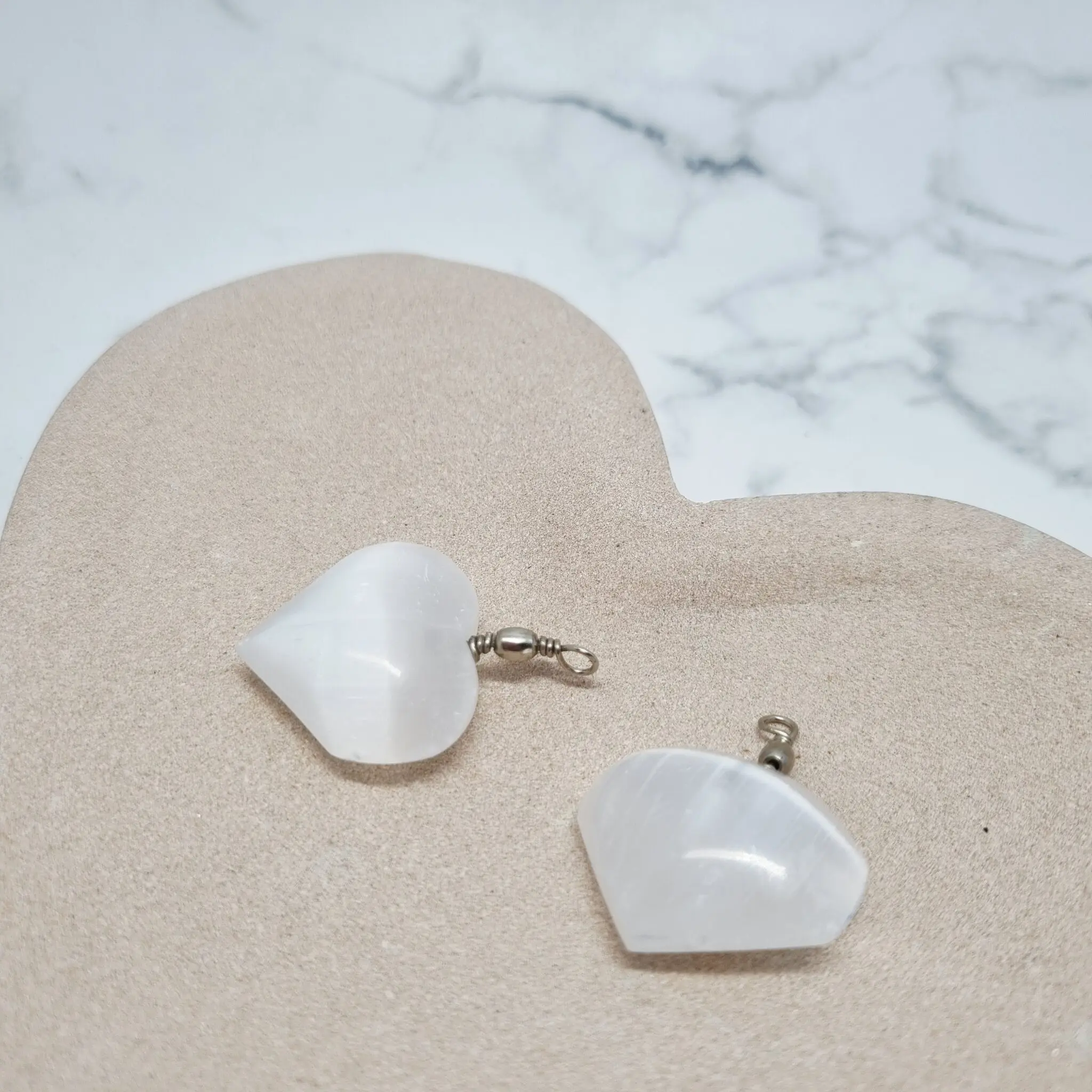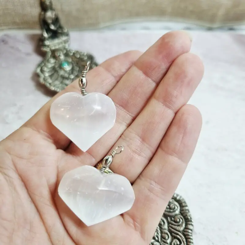 Obesek srce selenit je resnično edinstven. Oblika srca, izklesana iz sijočega selenita, oddaja občutek mehkobe in ljubezni. Selenit je v svoji naravni beli, prosojni barvi, ki spominja na luno. Površina je gladka, a hkrati razkriva nežne črte in plasti, ki so značilne za ta mineral, kar mu daje posebno teksturo in globino. Majhen srebrne barve obroček na vrhu srca omogoča enostavno pritrditev na verižico, s čimer se poudari eleganca in minimalističen dizajn.