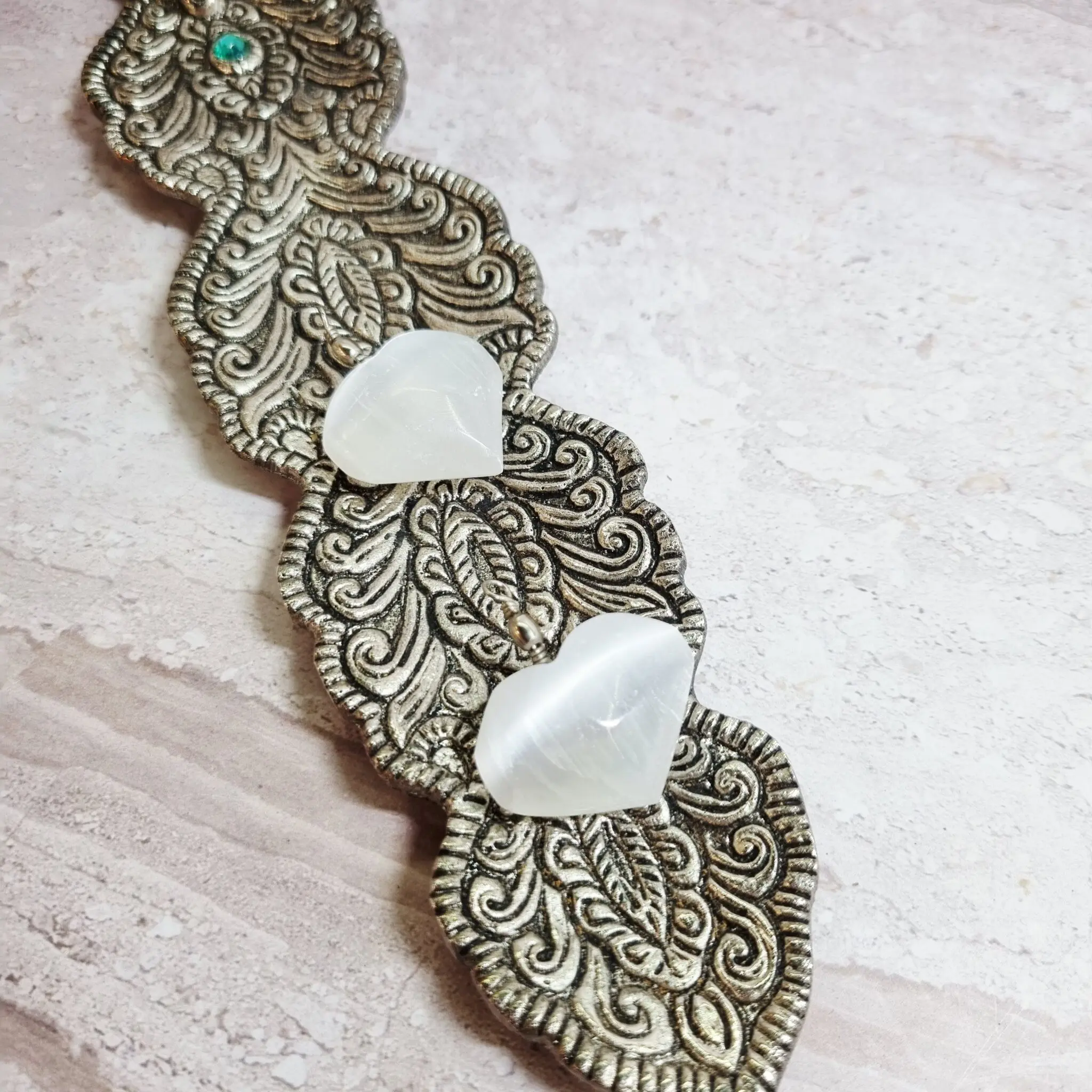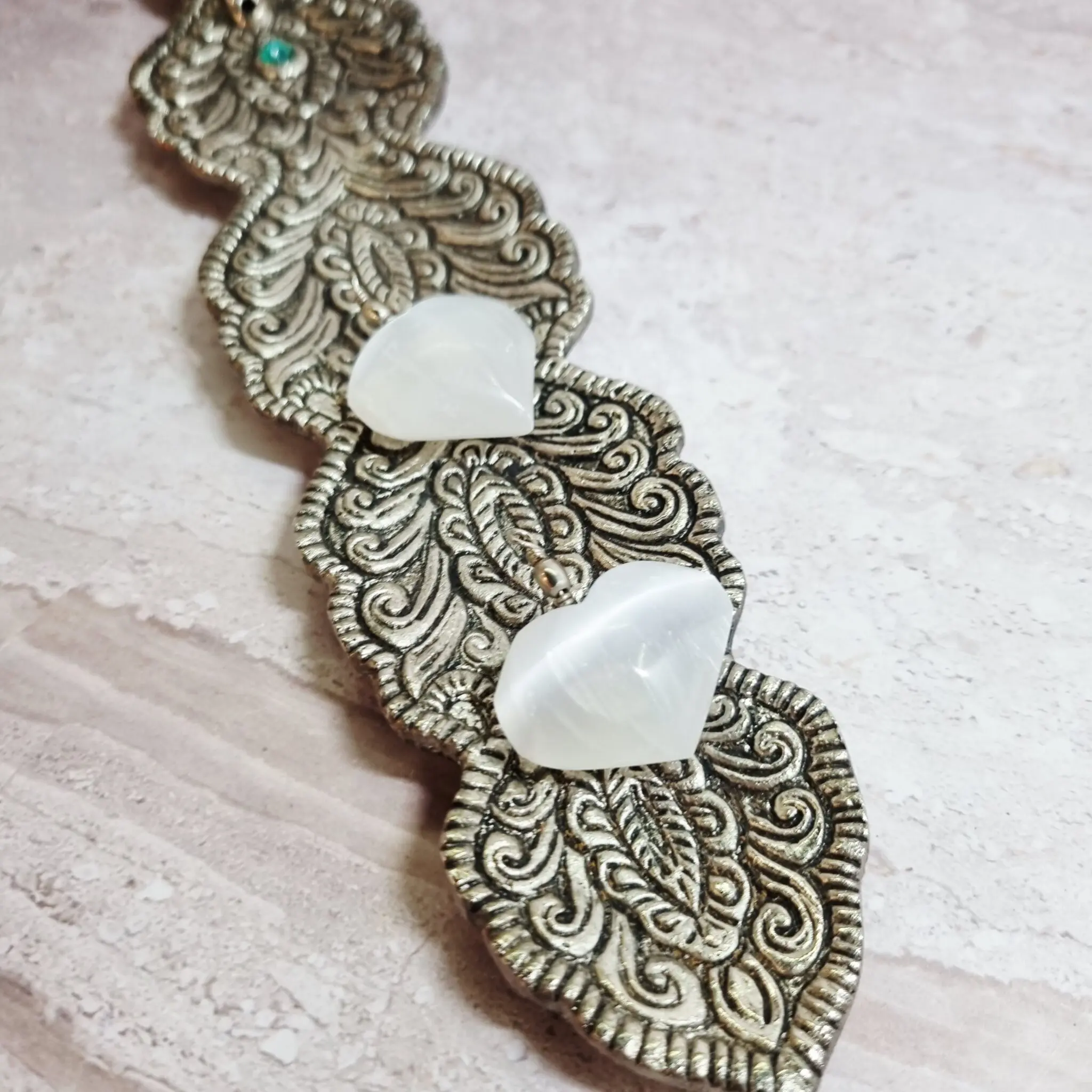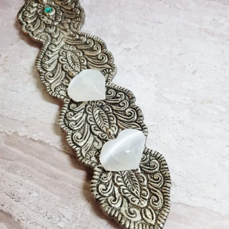 Obesek srce selenit se močno povezuje s kronsko čakro, ki je center naše duhovne povezave in višje zavesti. Pomaga pri čiščenju avre, odpravljanju negativnih energij in vzpostavljanju pretoka energije po telesu. Pravijo, da spodbuja duševno jasnost in umirjenost. Prinaša občutek globokega miru in pomaga pri meditaciji, saj vas nežno povezuje z duhovnim vodstvom.