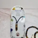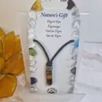 Obesek je oblikovan kot elegantna, podolgovata igla, ki ima na spodnji strani piramidno obliko in je izdelana iz čudovitega kamna tigrovo oko. Njegova barva prehaja med toplimi odtenki rjave, zlate in rumene, kar ustvarja značilen svilnat sijaj in nežen pasovni vzorec, ki se premika z vsakim gibom – prav takšen lesk ima v sončni svetlobi. Na vrhu kamna je srebrn okrasni element, ki drži obesek. Vrvica obeska je črne barve in je zaključena s kovinsko zaponko, ki zagotavlja varno in udobno nošenje. Ta kombinacija naravne lepote in preprostega dizajna omogoča, da se obesek lepo poda k različnim oblačilnim stilom, od vsakdanjih do bolj sofisticiranih.