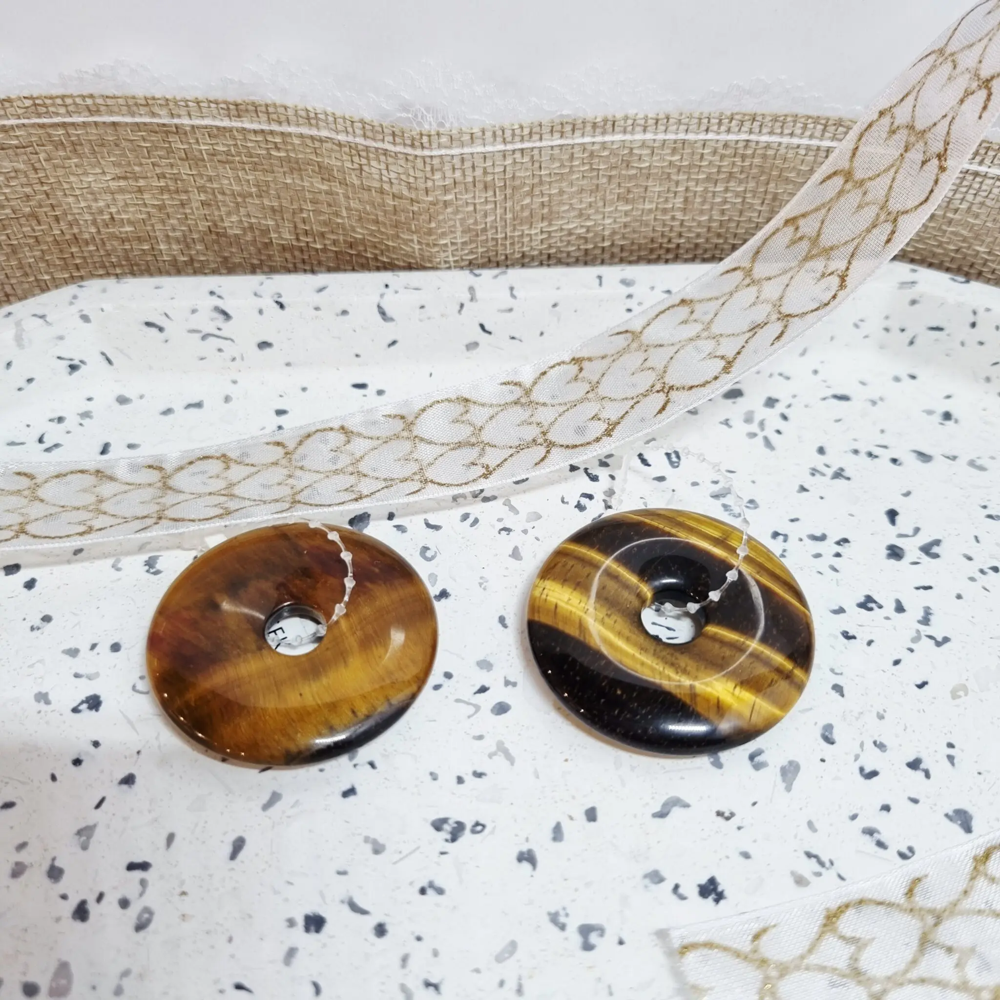 Obesek tigrovo oko je v obliki gladkega, poliranega krofa, kar mu daje prijeten, zaobljen videz in udoben občutek ob nošenju. Barva je čudovita kombinacija zlato-rjave in črne, s prepoznavnim svilenim sijajem, ki se premika in igra s svetlobo, kar ustvarja očarljiv učinek mačjega očesa. Vsak obesek ima edinstvene vzorce, ki so kot prstni odtisi narave, s svetlečimi črtami in pasovi, ki prečkajo površino. V sredini obeska je majhna luknja, značilna za obliko krofa, ki omogoča enostavno pritrditev na verižico ali vrvico.