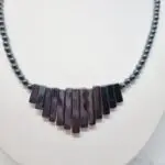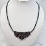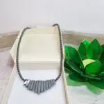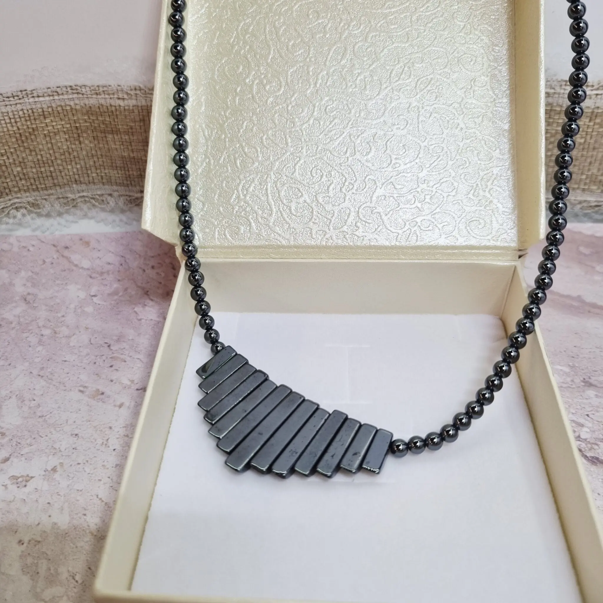 Ta čudovita ogrlica je sestavljena iz temnih, sijočih elementov hematita. Osrednji del krasi vrsta ploščatih, pravokotnih kosov, ki so razporejeni v obliki lepe, simetrične pahljače. Ti elementi se med seboj prepletajo in ustvarjajo eleganten vizualni učinek. Od središča vratu se na obeh straneh razprostirajo drobne, okrogle perle hematita, ki z lahkoto poudarjajo strukturo osrednjega dela in ogrlici dodajajo prefinjenost. Celotna ogrlica ima prelivajoč se sijaj, nekakšne kovinske sive in temne barve, ki se prelivajo med seboj. Njena dolžina je ravno pravšnja, 45 cm, da nežno leži na dekolteju in pritegne poglede. Ogrlica se zapre s kovinsko sponko.