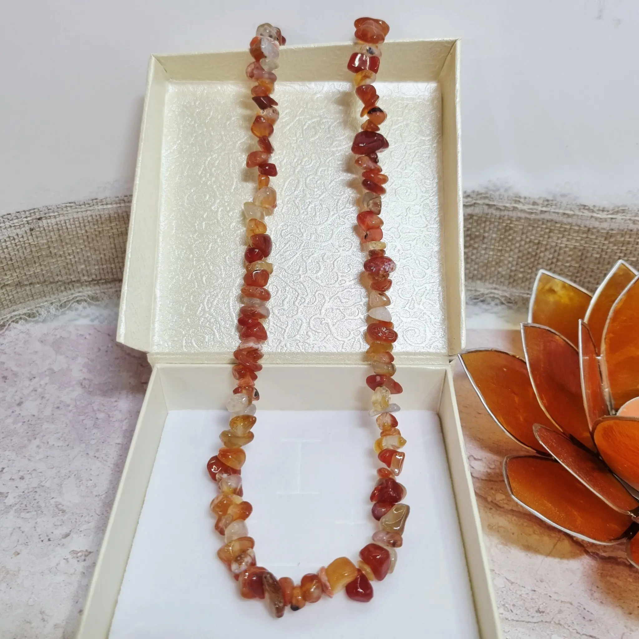 Karneol je kristal, ki že stoletja navdušuje s svojo lepoto in domnevnimi lastnostmi. Mislim, da je to eden tistih kristalov, ki ima resnično sposobnost, da vas prebudi in napolni z življenjsko silo. Spomnim se, ko sem nekoč imela občutek, da mi primanjkuje motivacije, in sem intuitivno posegla po karneolu. Njegova prisotnost mi je pomagala, da sem se zbrala in ponovno našla iskrico v sebi, da sem se lotila projektov z novo energijo. Ta ogrlica je idealna za vse, ki iščejo oporo pri premagovanju strahov, pri zagonu novih projektov ali preprosto želijo v svoje življenje priklicati več veselja in entuziazma.