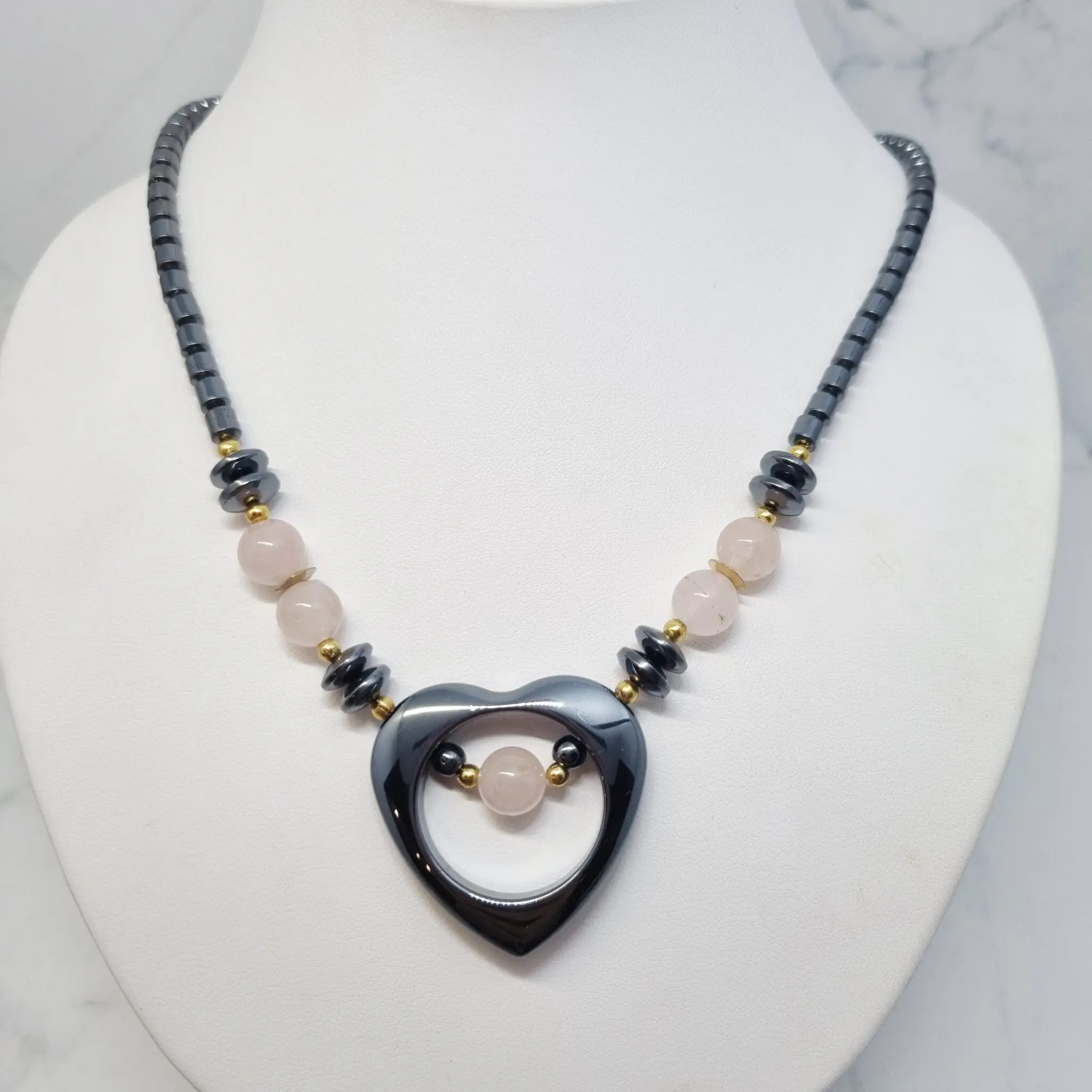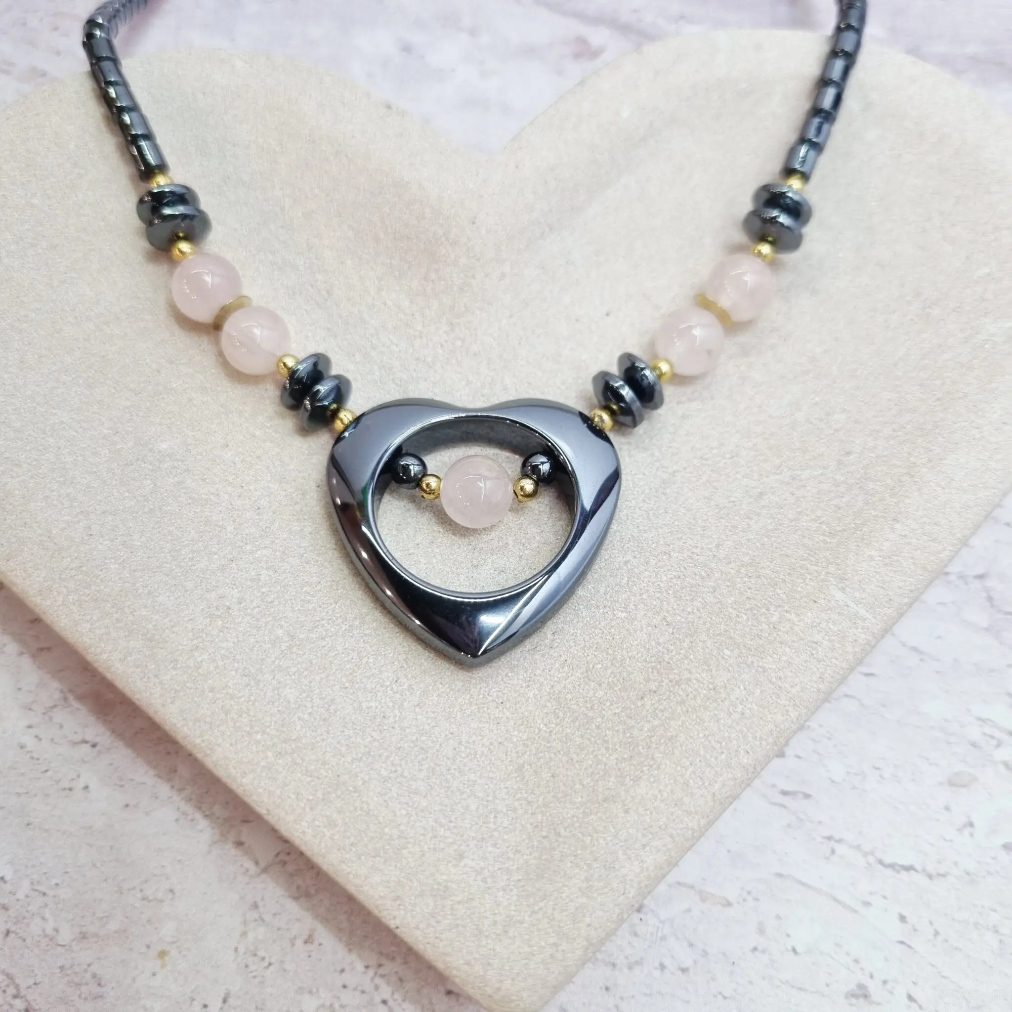Ta izjemna ogrlica je sestavljena iz več delov, ki se harmonično prepletajo. Osrednji del krasi sijoče, temno sivo srce iz hematita, ki ni zaprto, temveč ima v notranjosti, ob dnu, majhno, nežno rožnato kroglico iz roza kremena, uokvirjeno z drobnimi zlatimi kroglicami. Ob straneh osrednjega srca se nizajo ploščati, trapezni hematitovi kosi in nežne kroglice roževca Ti elementi so prepleteni z drobnimi, sijočimi zlatimi kroglicami, ki dodajajo ogrlici prefinjenost in topel sijaj. Preostali del ogrlice sestavljajo podolgovati, valjasti hematitovi kamni, ki tvorijo elegantno verigo v temno sivi barvi. Celota deluje zelo uravnoteženo in privlačno, s prekrasno interakcijo med temnejšimi toni in svetlo rožnato barvo. Ogrlica je dolžine 45 cm in se zapre s sponko.
