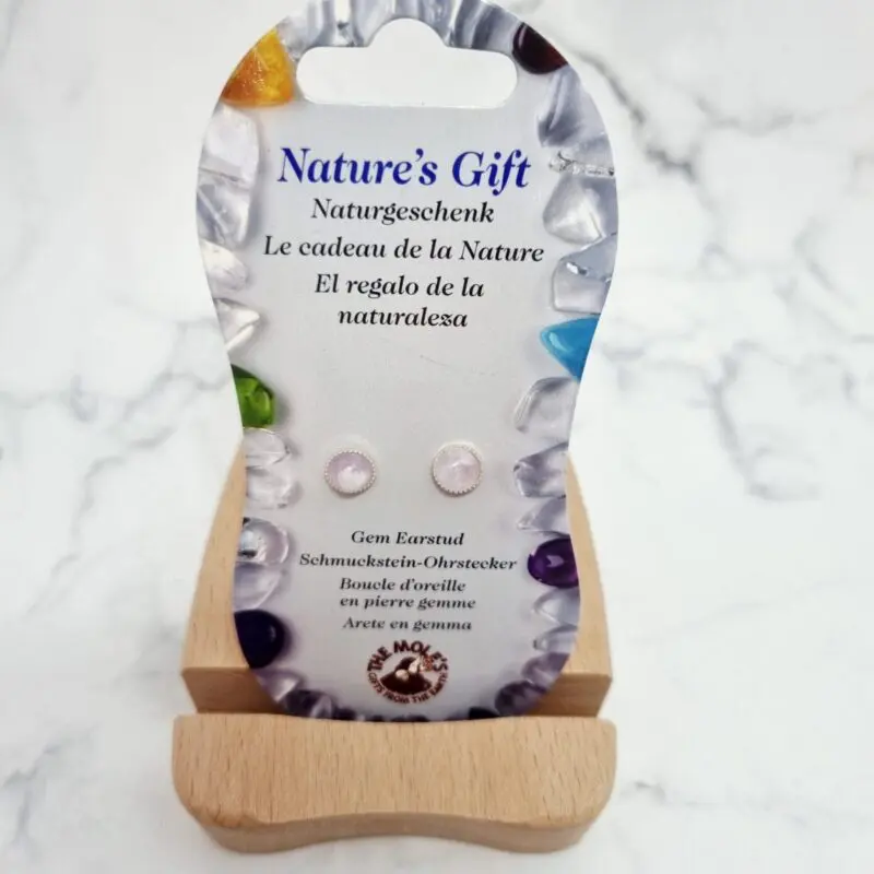 Uhani so oblikovani kot majhne, zaobljene bunkice iz nežnega roževca. Ta kristal se ponaša z mehko, pastelno rožnato barvo, ki je lahko prosojna ali rahlo motna, kar daje vsakemu kosu edinstven in naraven videz. Okoli vsakega roževca je srebrne barve rob z drobnim valovitim vzorcem, ki bunkice elegantno uokvirja. Ti uhani z zatiči so zasnovani za udobje in varnost.
