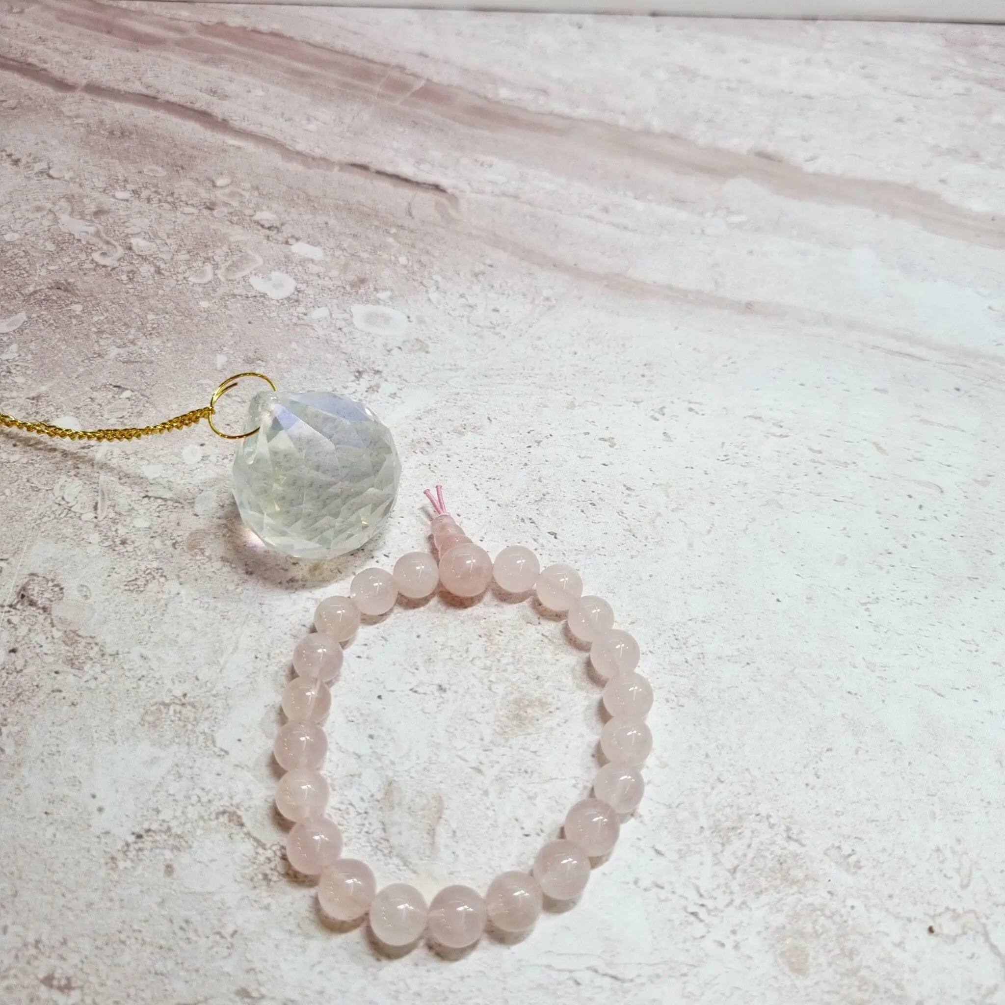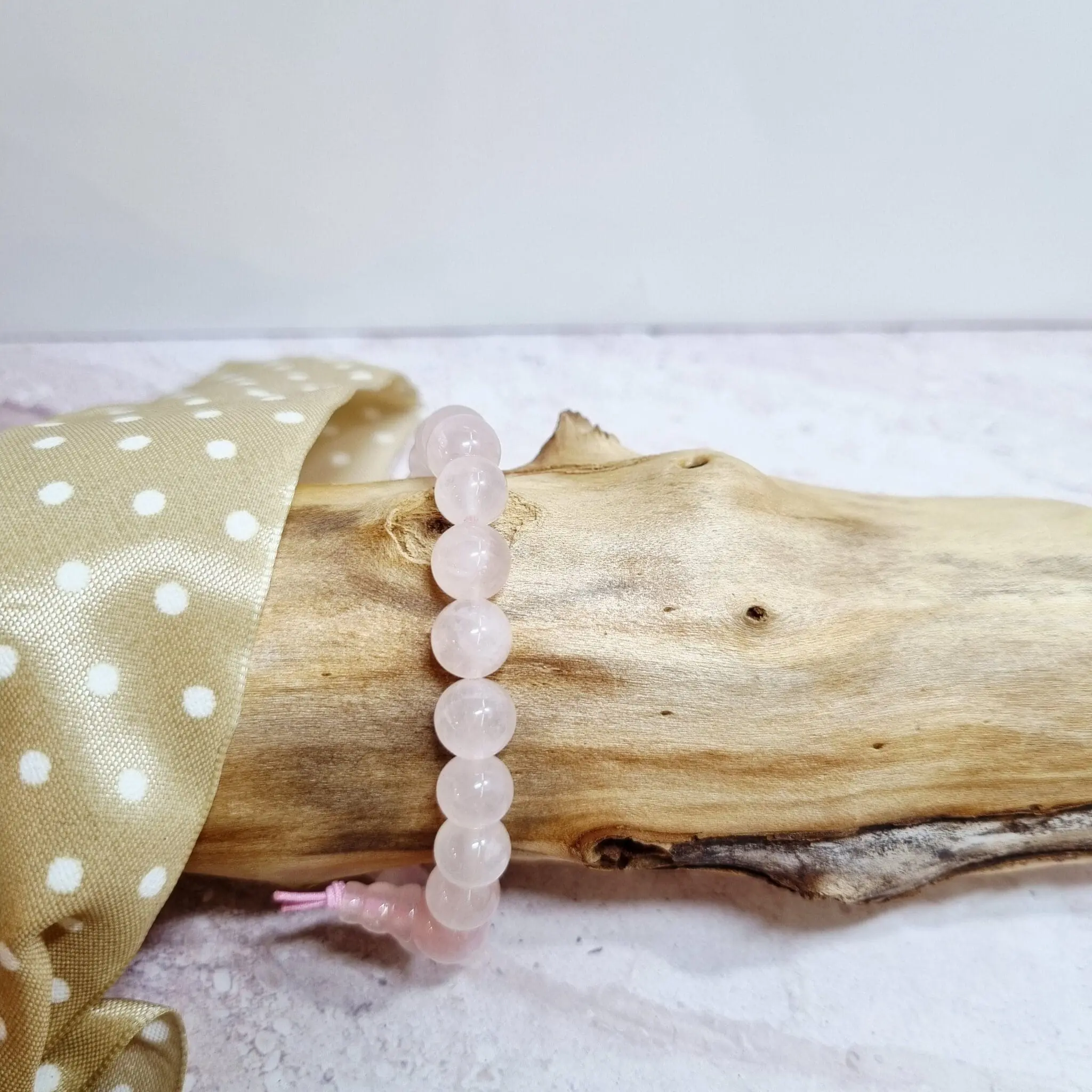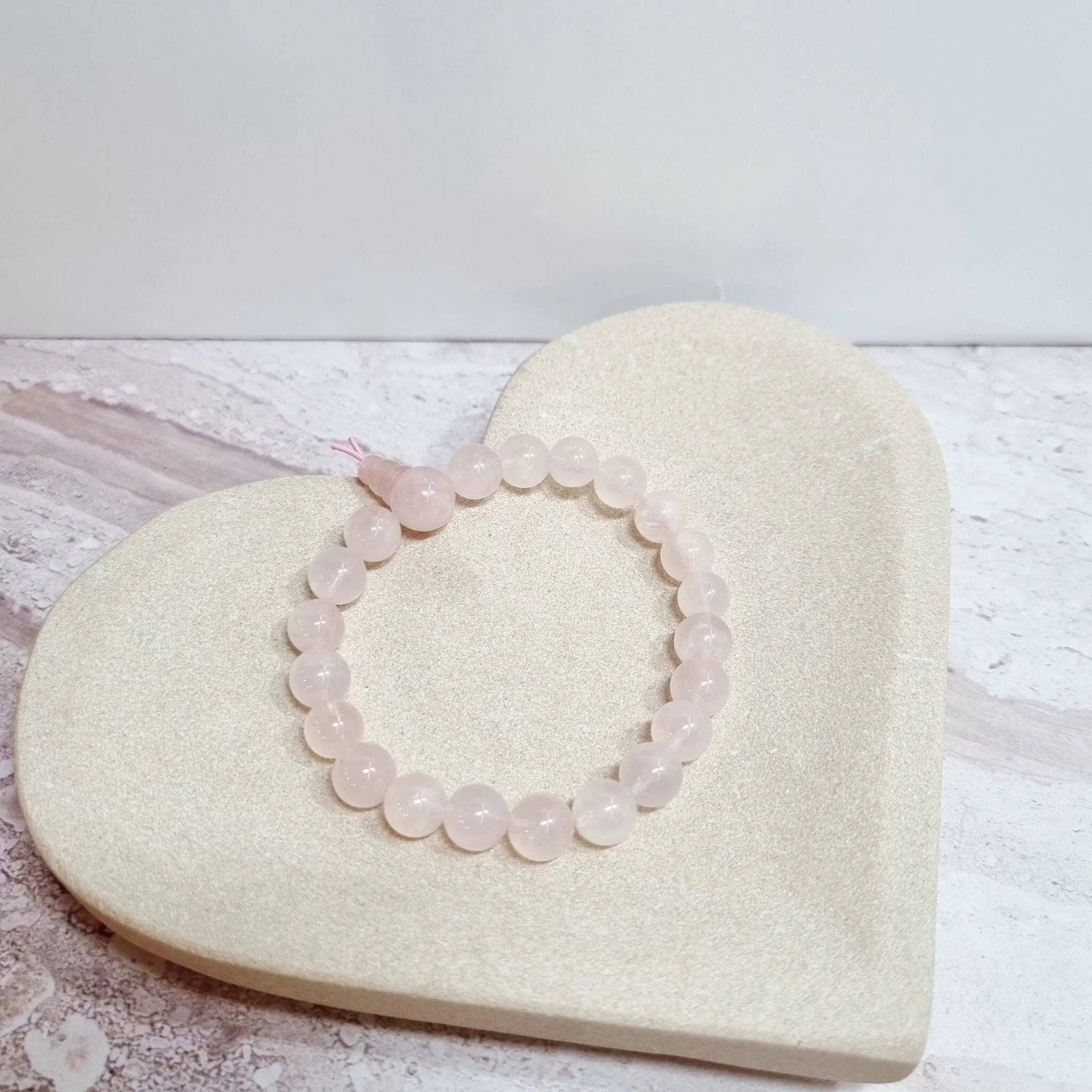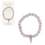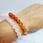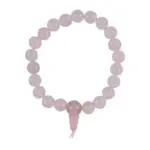 Ta čudovita zapestnica je sestavljena iz poliranih kroglic nežno rožnatega roževca. Vsaka kroglica je gladka in zaobljena, kar ustvarja prijeten občutek ob dotiku in eleganten videz na zapestju. Barva roževca je svetla, prozorna rožnata, ki se lahko giblje od skoraj bele do nežno pastelne rožnate, odvisno od svetlobe. Zapestnica je nanizana na elastično vrvico, kar omogoča enostavno prilagajanje in udobno nošenje za različne velikosti zapestij. Kroglic je veliko, kar daje zapestnici polnost in mehak videz. Na enem koncu je majhen vozel, ki drži vrvico skupaj in diskretno označuje zaključek.