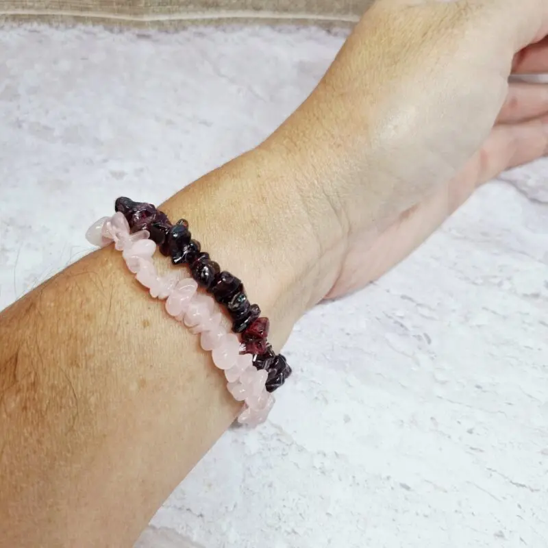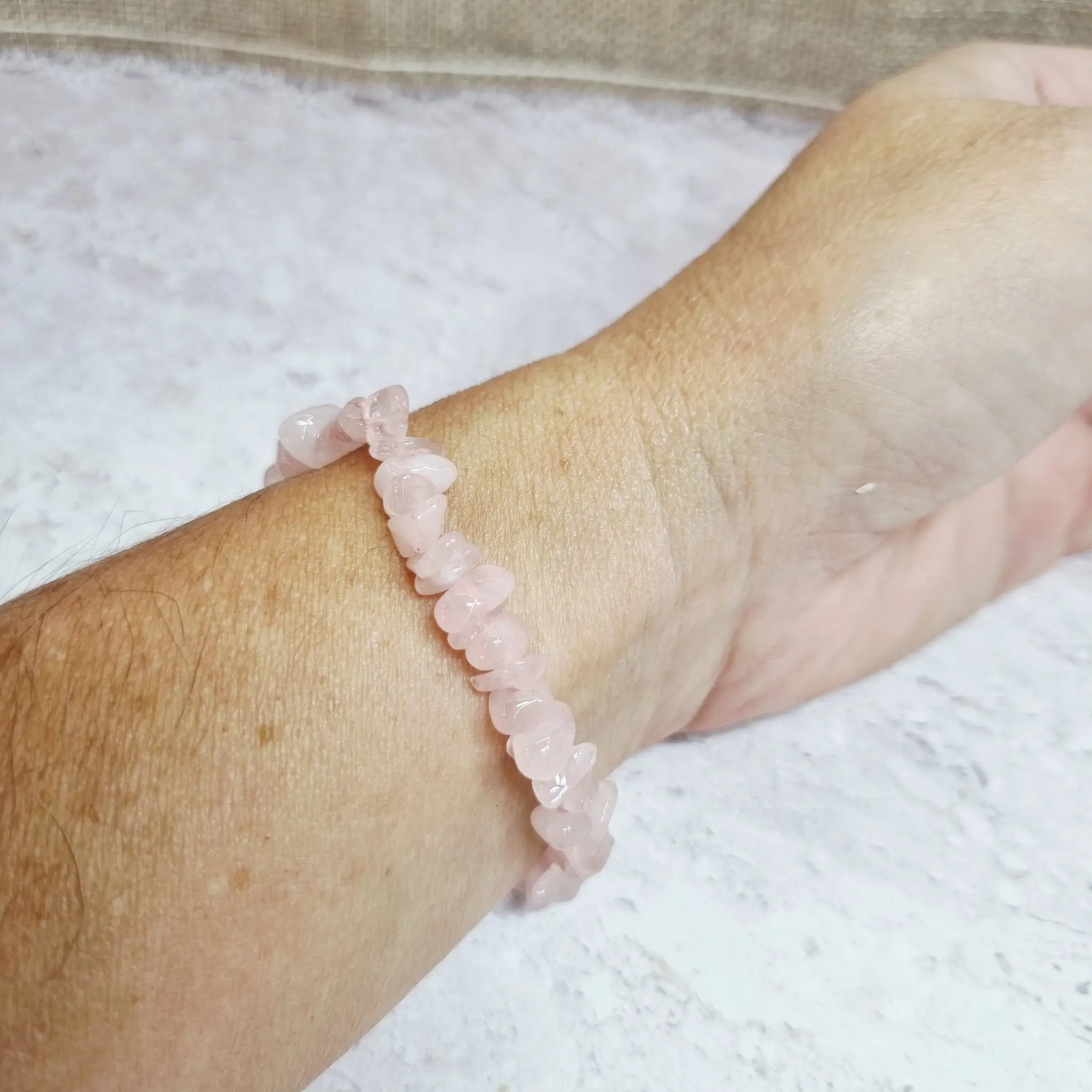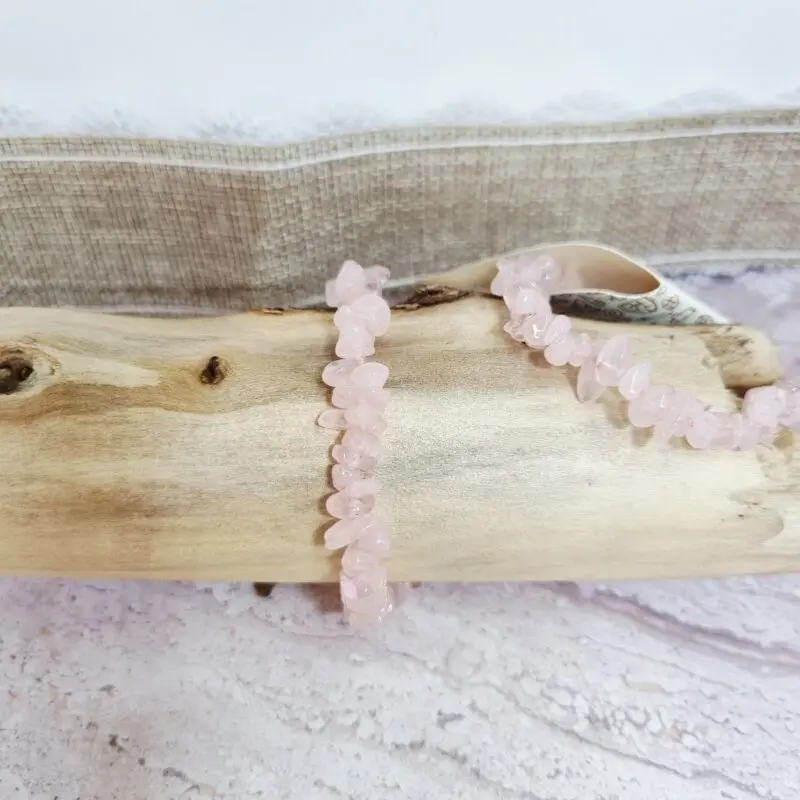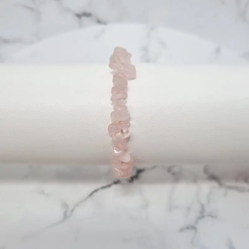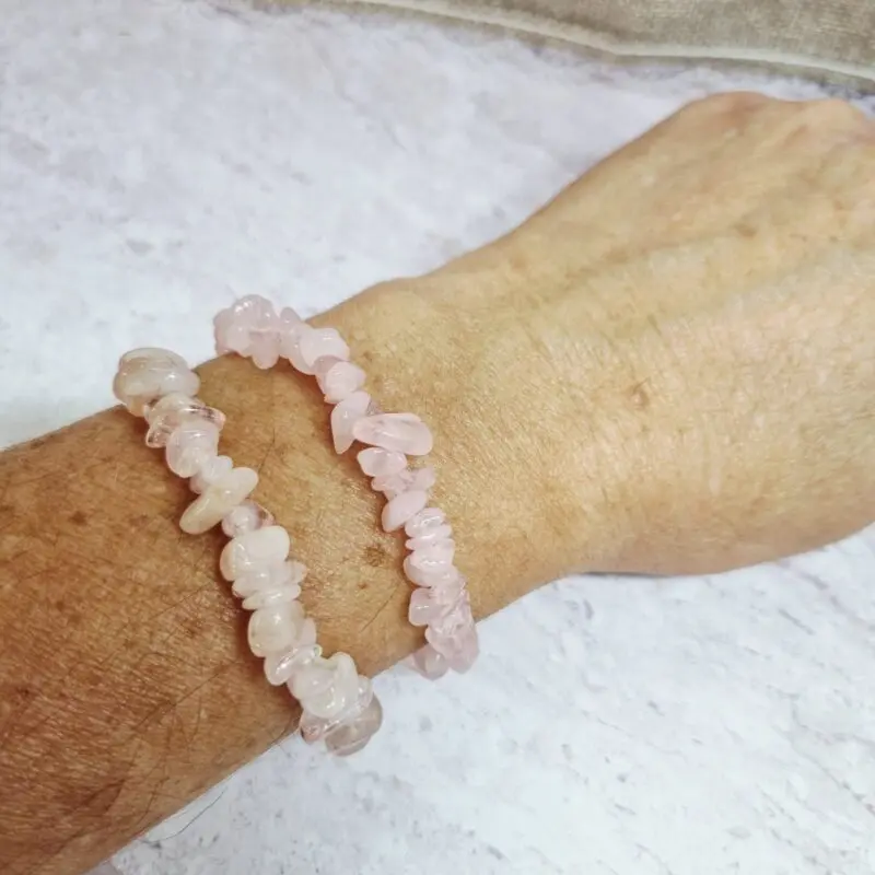 Naša elastična zapestnica roževec je sestavljena iz številnih majhnih, neenakomerno oblikovanih koščkov. Barva kristalov je nežno rožnata, s subtilnimi variacijami, ki poudarjajo naraven izvor kamna. Vsak majhen “ščepec” roževca je nežno zaobljen in poliran, kar daje zapestnici sijaj in prijeten občutek na koži. Zapestnica je nanizana na elastično vrvico, kar zagotavlja udobno nošenje in enostavno prilagajanje različnim velikostim zapestja.
