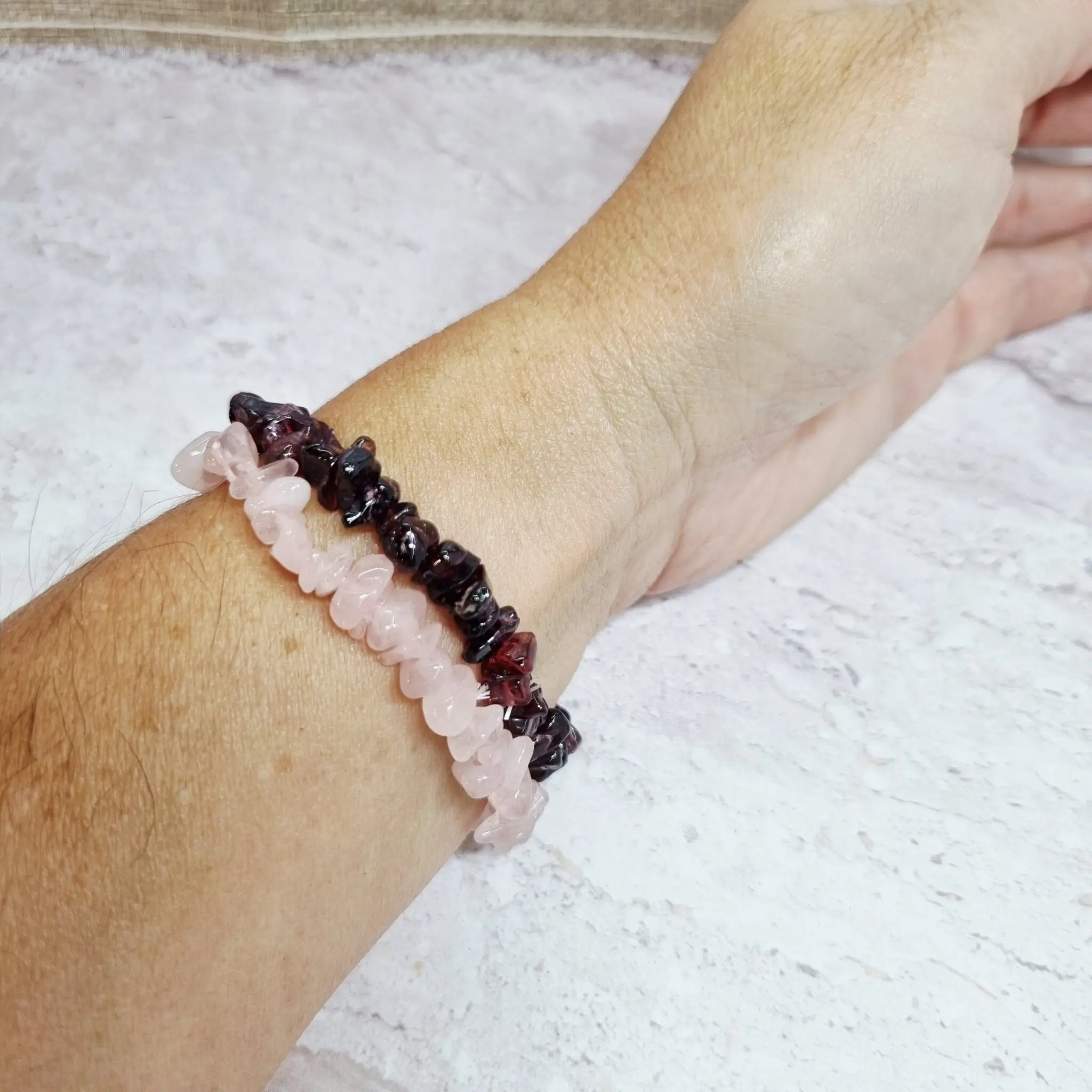 Ta čudovita zapestnica je narejena iz poliranih koščkov roževca, ki so bili skrbno izbrani in nanizani na elastično vrvico, da se popolnoma prilega vsakemu zapestju. Je vsestranski dodatek, ki ga lahko nosite vsak dan, in vas bo nenehno opominjala na blagodejne vibracije ljubezni in harmonije. Spominjam se, ko sva z Mitjem prvič držala v rokah to pošiljko roževca – oba sva takoj začutila izjemno nežnost in pomirjenost, ki jo izžareva. Nič čudnega, da se ta kamen tako močno povezuje s srčno čakro.