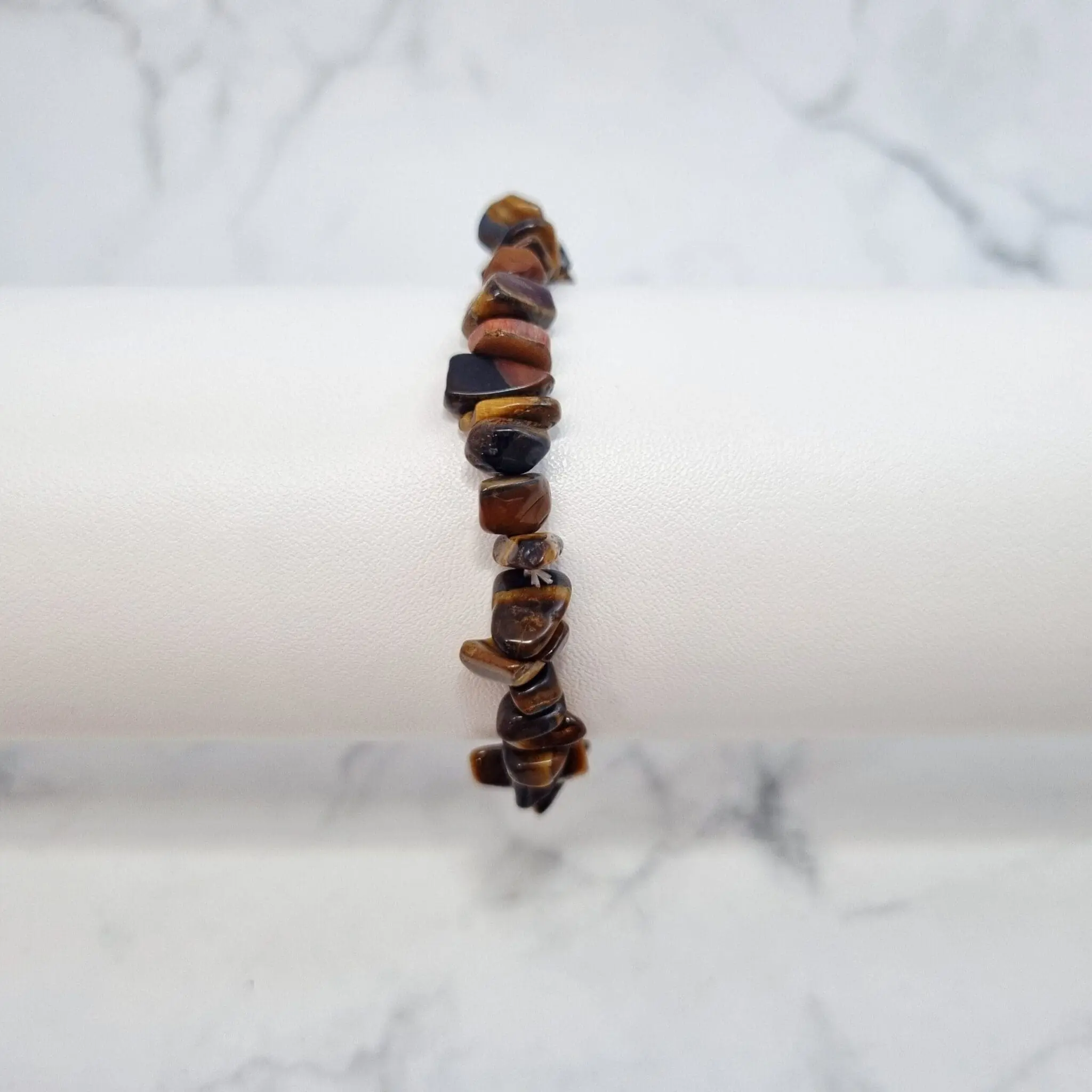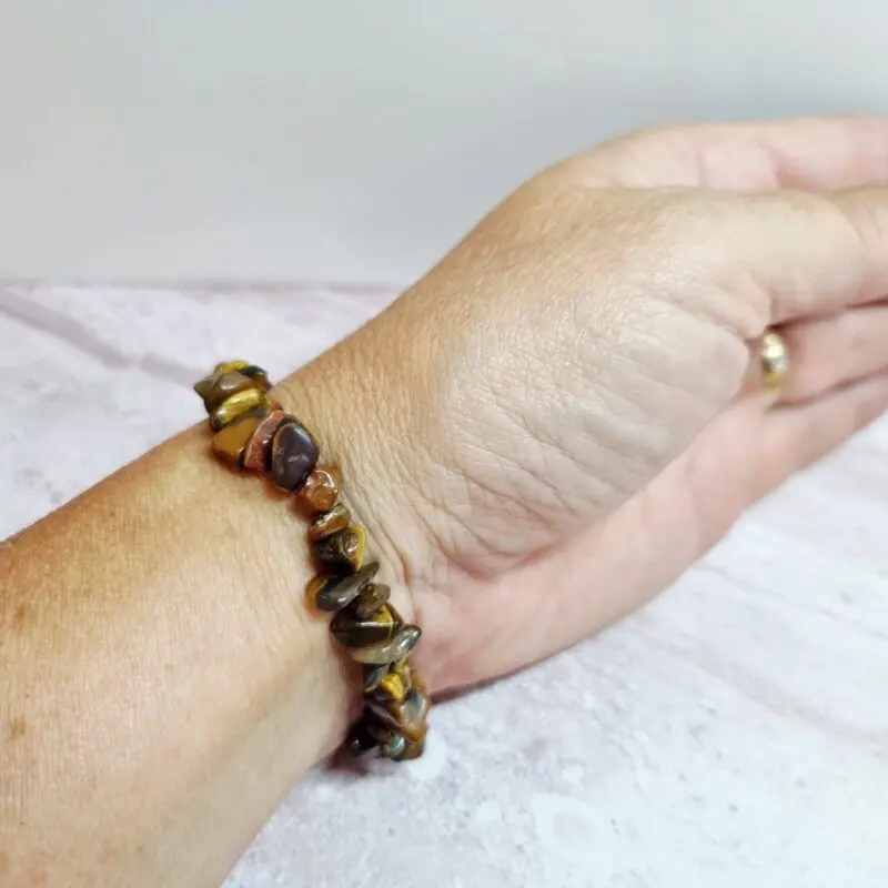 Zapestnica tigrovo oko je sestavljena iz številnih majhnih, nepravilno oblikovanih koščkov tigrovega očesa, ki so skrbno polirani. Barvna paleta se giblje od tople zlate in medeno rjave do temno rjave, z značilnimi svetlečimi vlakni, ki ustvarjajo edinstven učinek “mačjega očesa” ali svilnatega sijaja. Nekateri koščki imajo lahko tudi rdečkaste ali črne odtenke, kar doda še več globine. Ker so to naravni “chips” koščki, je vsaka zapestnica unikatna in nosi svojo zgodbo, svoje barve in vzorce. Elastična vrvica diskretno poveže te čudovite kristalčke v udoben in prilagodljiv kos nakita, ki se lepo oprijema zapestja.