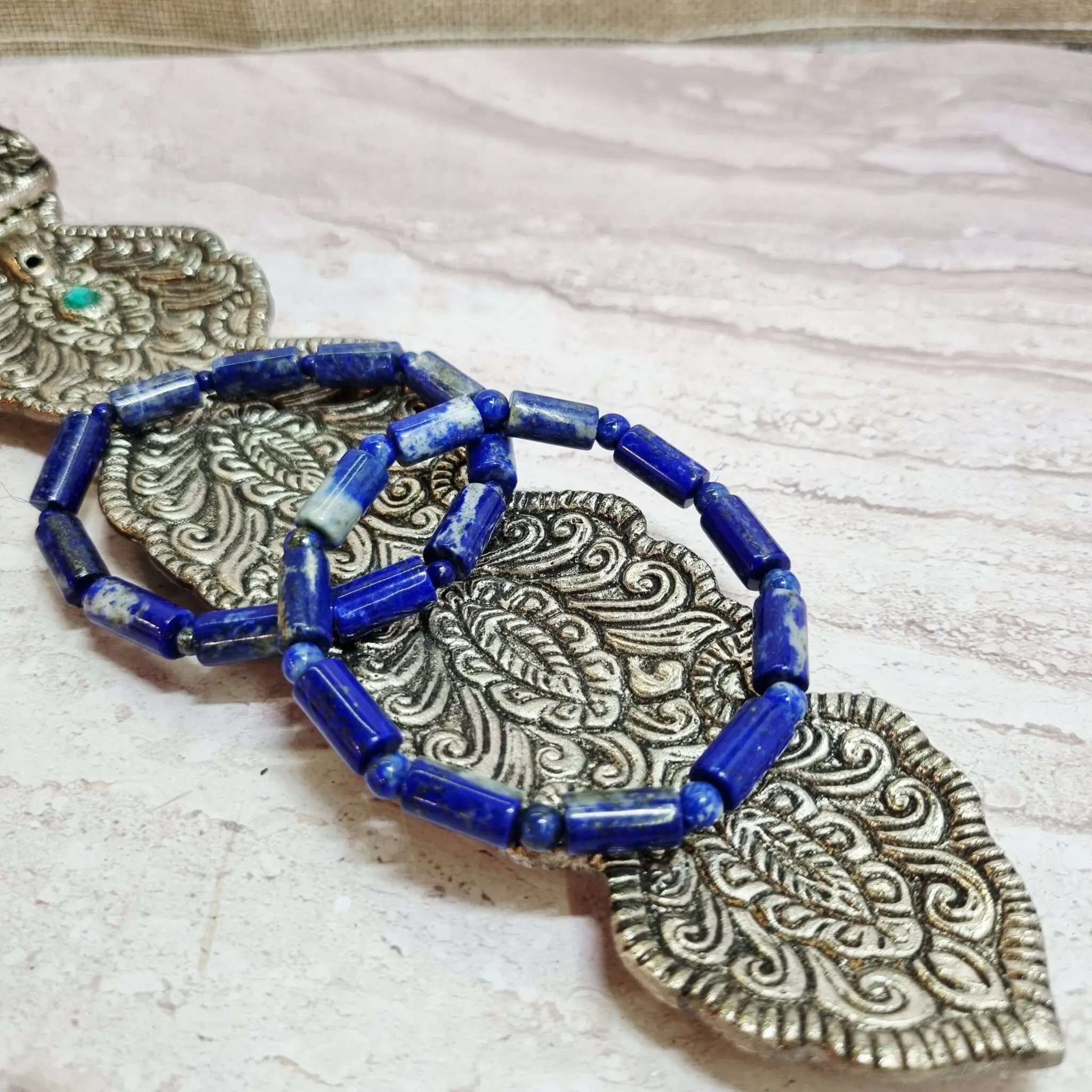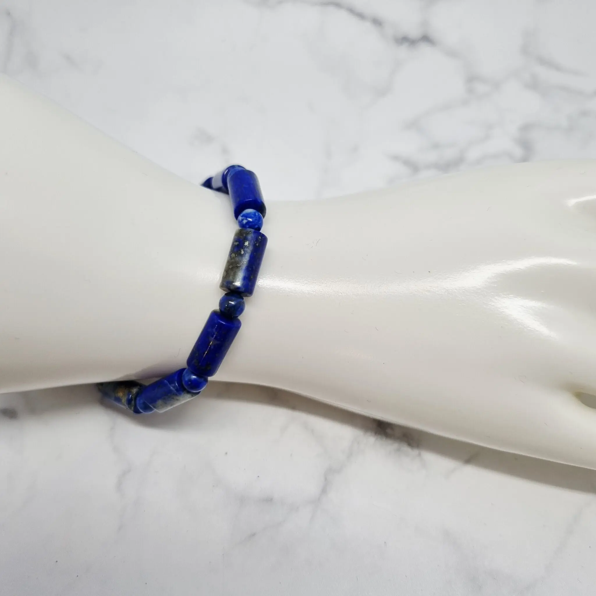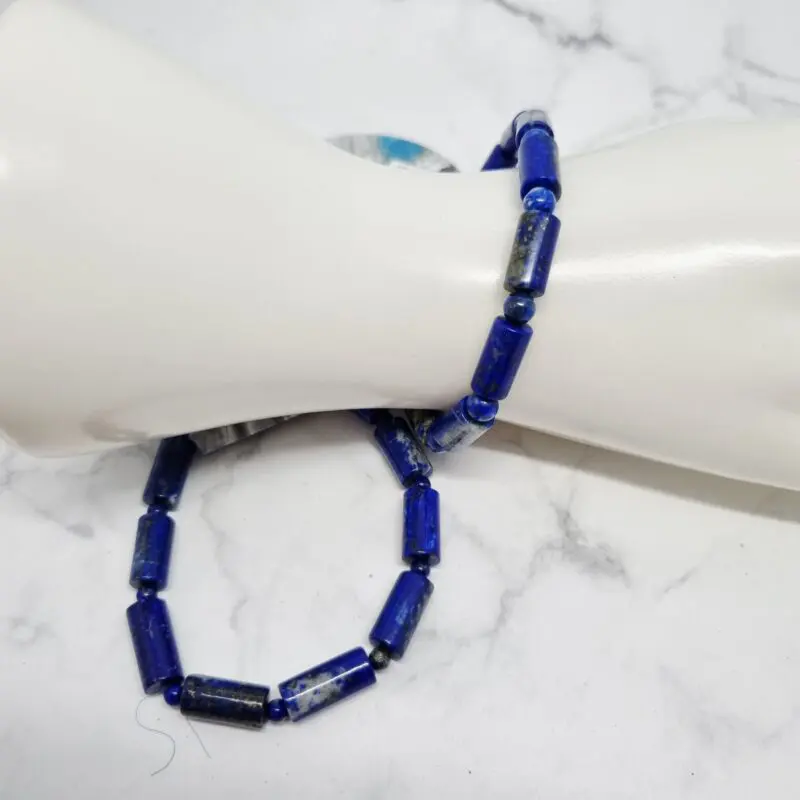 Zapestnica je sestavljena iz čudovitih, gladko poliranih valjev lapis lazulija, ki se ponašajo z intenzivno, globoko modro barvo. Vsak valjček je unikaten, saj vsebuje značilne zlate pike piritov in bele do sivkaste inkluzije kalcita, ki dodajo teksturo in globino. Ta naravna raznolikost ustvarja očarljiv kontrast in poudarja naravno lepoto kamna. Valjčki so nanizani na elastično vrvico, kar zagotavlja udobno prileganje in enostavno nošenje za vsakogar. 💎