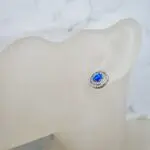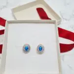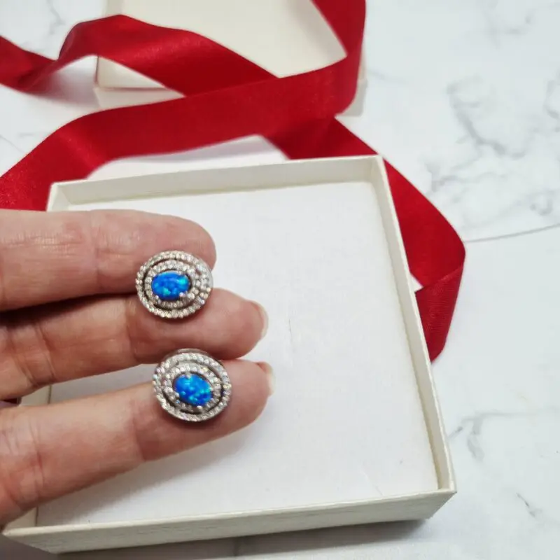 Ti osupljivi uhani se ponašajo z nežno ovalno obliko, ki v sredini ponosno nosi hipnotičen modri opal. Barva opala je živa in večplastna, igra odtenkov modre, ki spominjajo na morsko gladino v sončnem vremenu. Okrog osrednjega modrega opala je eleganten rob, bogato okrašen z drobnimi, bleščečimi kamenčki, ki jim dodajo pridih sijaja in prefinjenosti. Celotna zasnova je v srebrni barvi, kar še poudarja intenzivnost modrega opala in ustvarja čudovit, harmoničen kontrast. So zelo privlačni in elegantni.